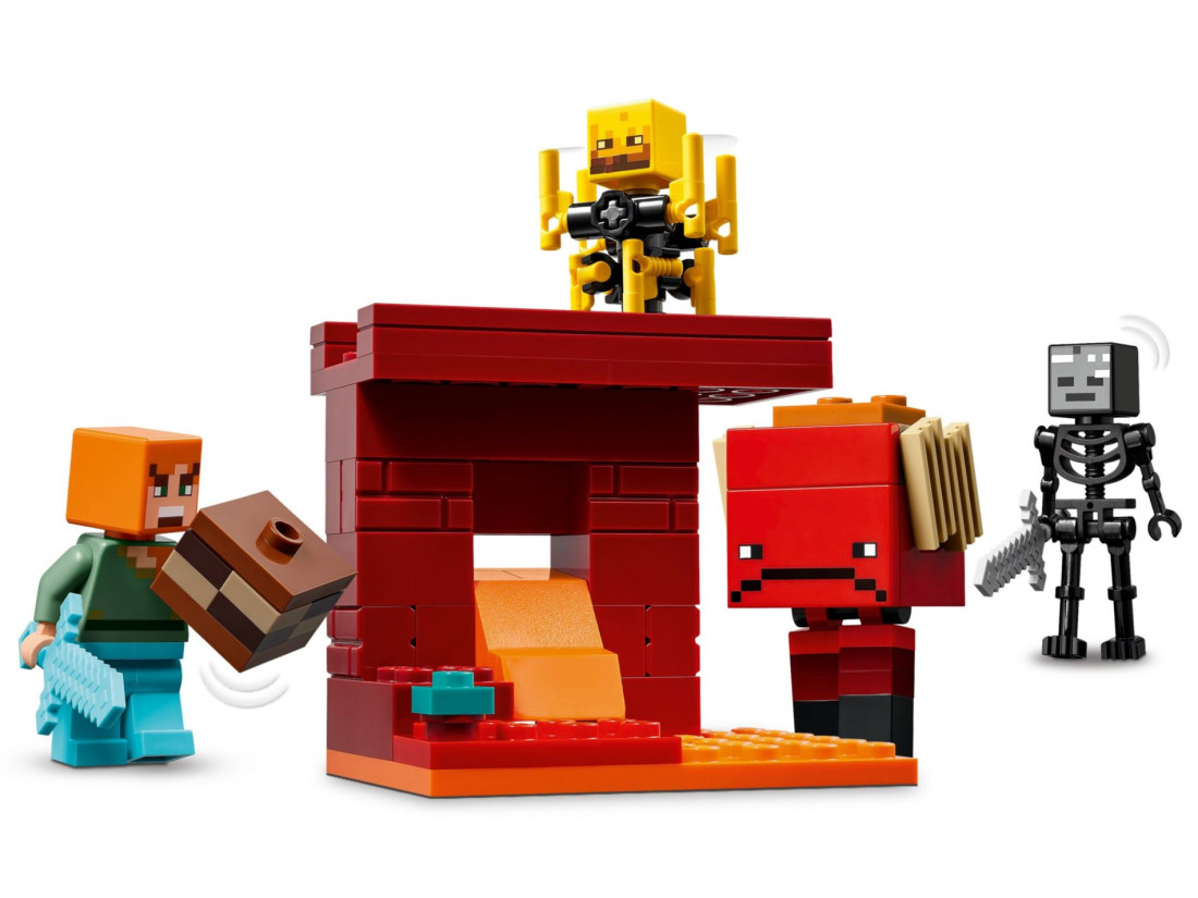 - Активний ігровий набір Minecraft® – Включає будову частину мосту Нижньої фортеці, а також фігурки Алекс, скелета-вбивці, blaze та strider зі зброєю та аксесуарами.