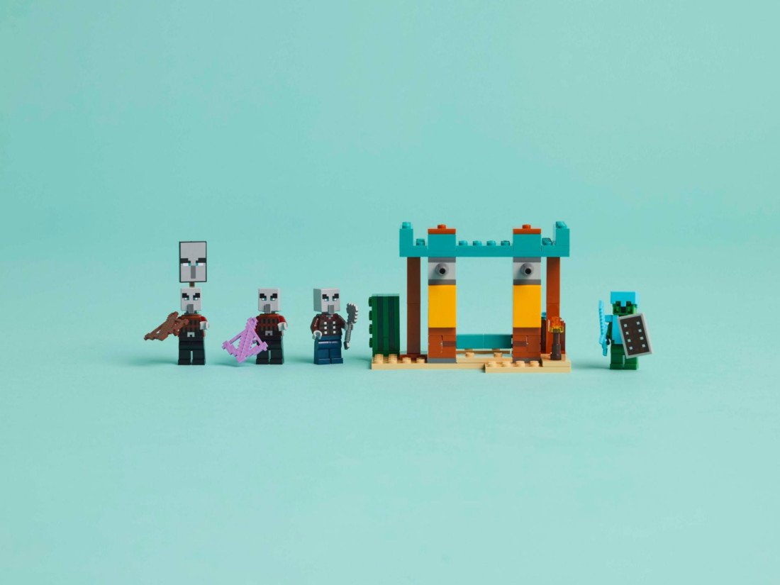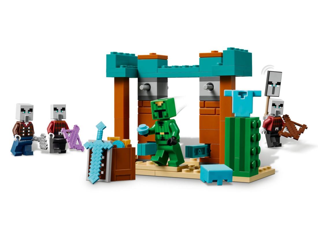 Дія відбувається в пустельному форпості Minecraft®, де діти можуть грати роль Cactus Knight з його алмазною бронею, щитом та мечем. Коли три фігурки illager приходять вкрасти скарб, діти повинні захистити форпост. У набір входять ракети, які можна запускати простим клацанням пальця, різноманітна зброя та бочка, що містить скарб. Для додаткової цифрової розваги LEGO Builder дозволяє дітям збільшувати та обертати моделі в 3D за допомогою пристрою.