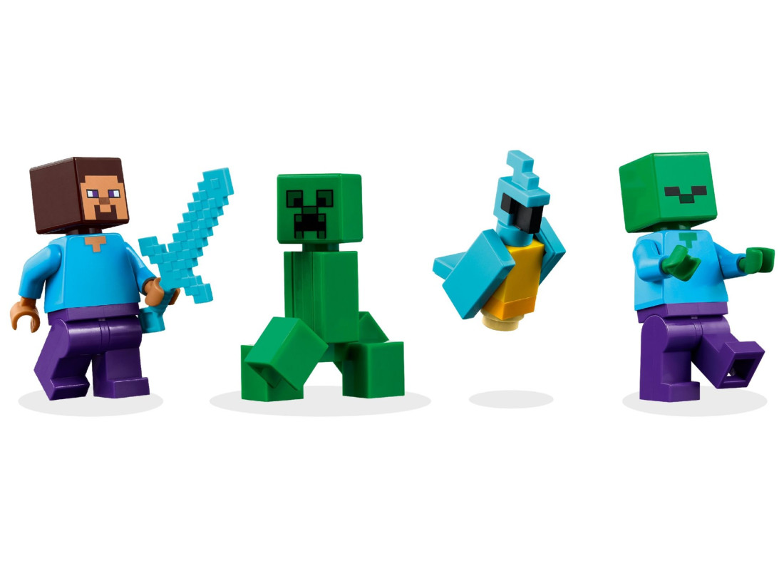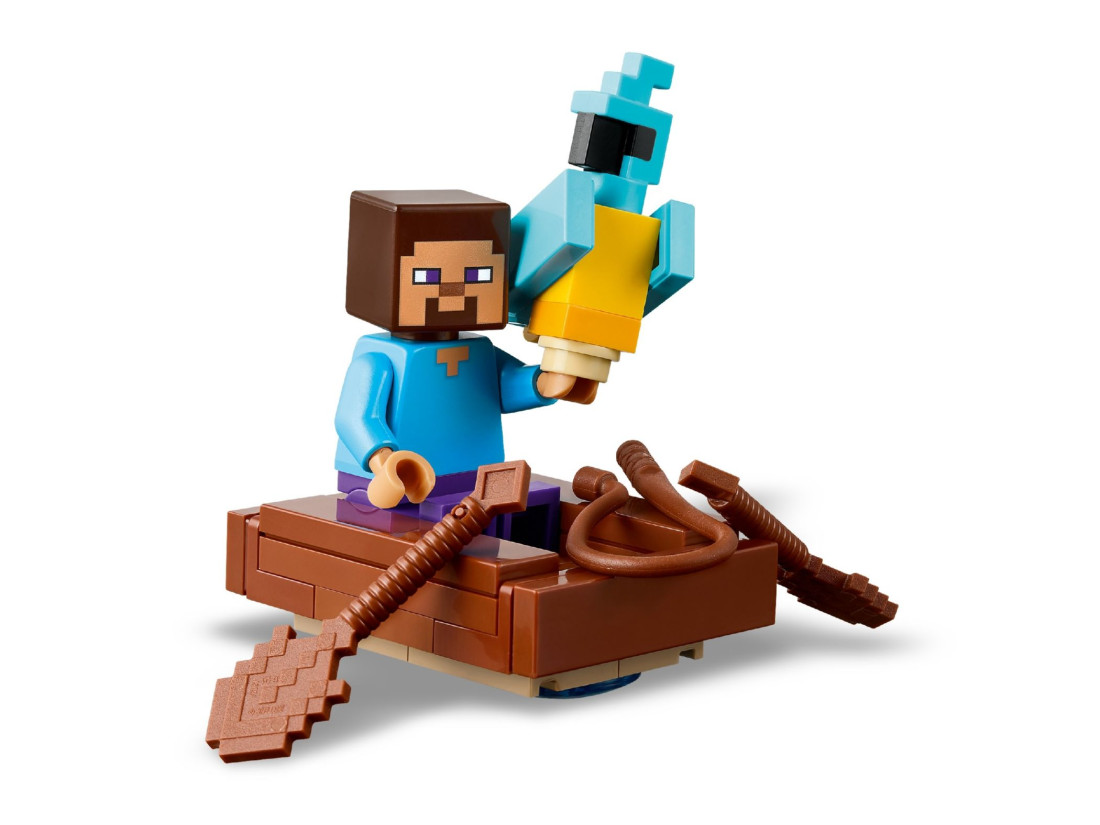 Герої та аксесуари: фігурки Стіва, Крипера та зомбі, човен, вудка з рибкою, папуга та тропічна рослинність — все для насиченої рольової гри.