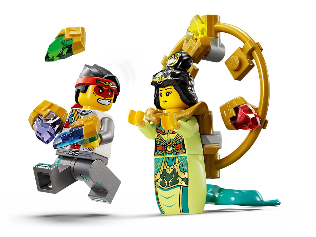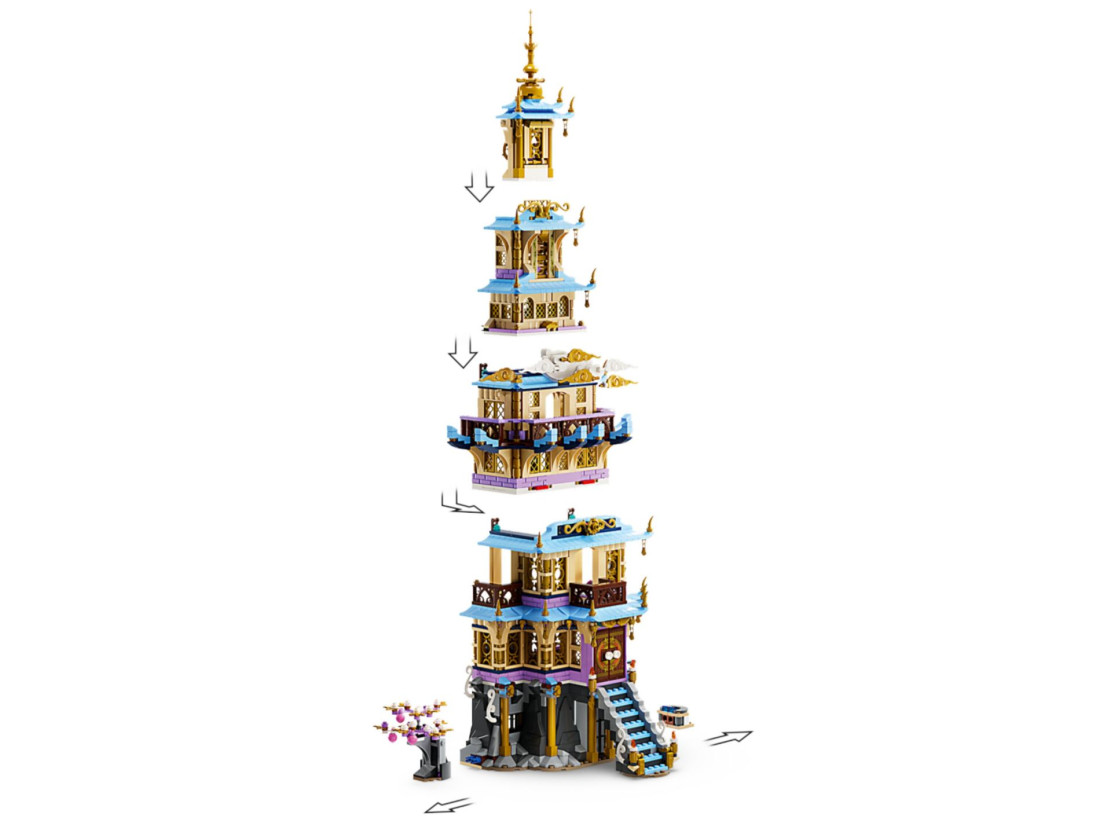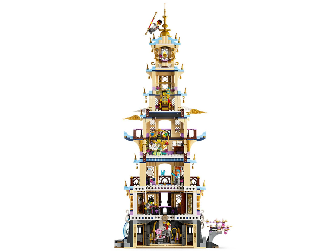 Відкрийте для себе чудеса всередині, у тому числі в'язницю, бібліотеку, тронний зал з деталізованим троном, кімнату в вежі з власником кольорового каміння та багато іншого. У комплект входять 7 мініфігурок, у тому числі Мей, Монкі Кід, Пігсі, Сенді, Нюва, містер Тан і Лі Цзін, а також чарівна фігурка кота LEGO® Baby Mo — на пригоду чекає!