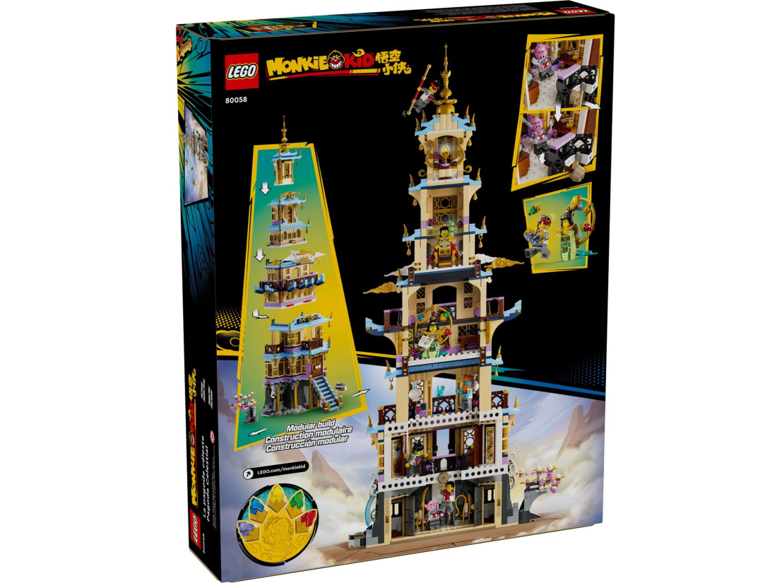 Візьміть у чарівну пригоду з набором LEGO® Monkie Kid™ «Небесна пагода» (80058), покликаним захопити шанувальників фентезі та дітей віком від 10 років і старше. Цей ретельно деталізований конструктор пропонує чудове заняття для всієї родини. Він включає пагоду з 6 рівнями, розділеними на 4 секції.