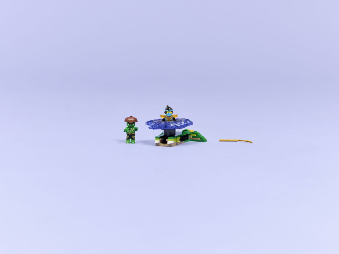 LEGO NINJAGO Нія проти чудовиська мутацій (71849) — компактний бойовий набір зі спінером за мотивами серіалу NINJAGO: Dragons Rising. Зберіть модель, встановіть спінер на пускову платформу та запустіть натисканням кнопки: він розкручується на великій швидкості й може збивати ціль. Під час зіткнення два елементальні модулі відлітають, створюючи ефект несподіванки в сутичці.