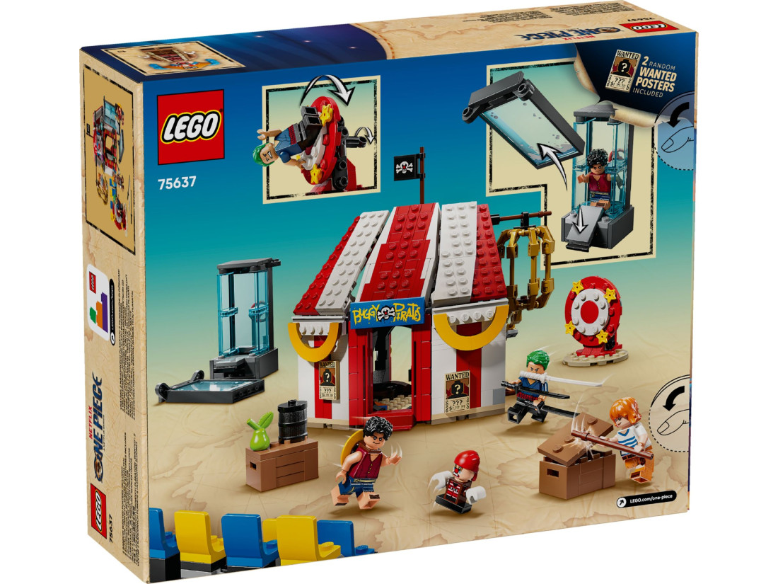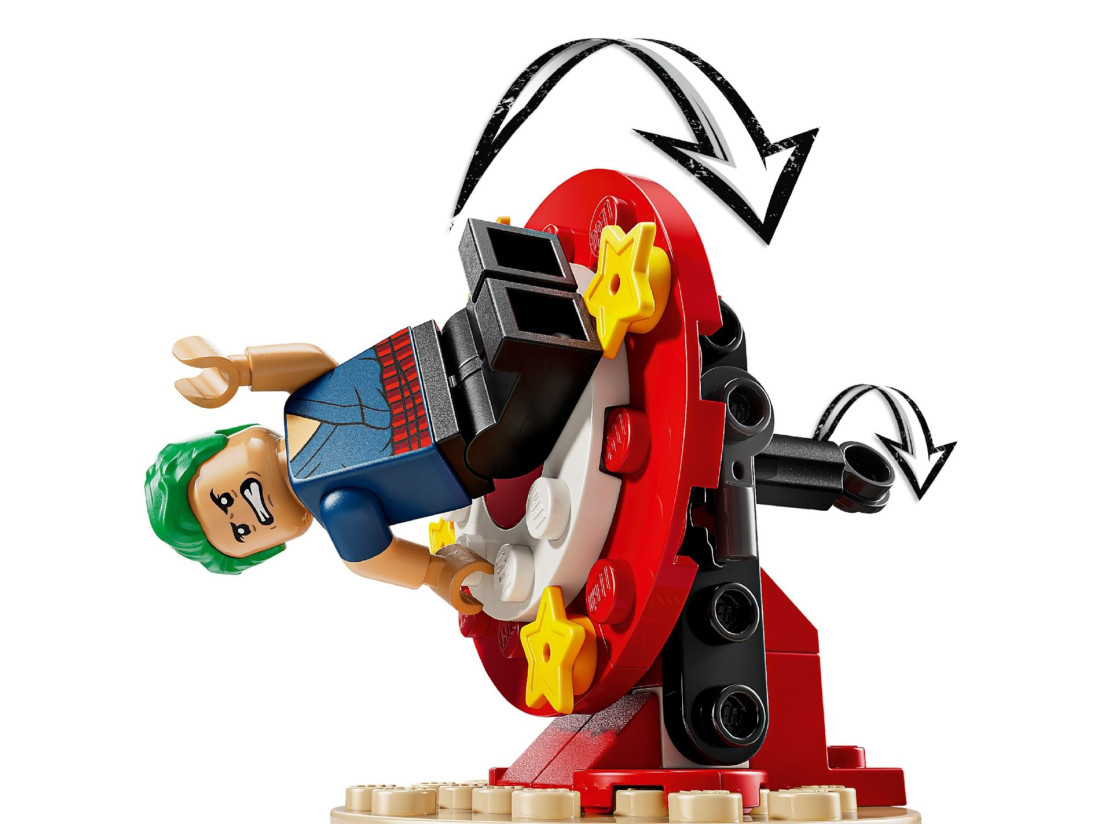 Всередині передбачено три випробування: резервуар з водою, обертовий стіл і підвісна клітка для видовищних порятунків. У комплект входять мініфігурки Луффі, Зоро, Намі та клоуна Баггі з автентичними аксесуарами та зброєю. Ящики та бочки в інтер’єрі приховують деталі для мікромоделі Баггі та двох плакатів «Wanted». Габарити шатра після складання: висота 16 см, ширина 15 см, глибина 14 см — компактний формат для полиці та ігор, зі зручним доступом до всіх зон.