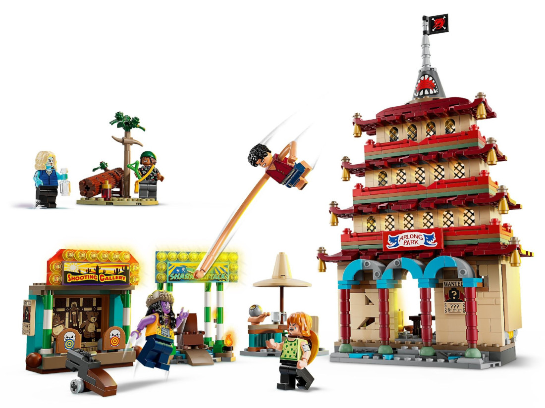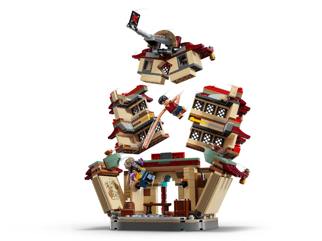 Головну споруду займає пагода з механізмом обвалення даху: натисніть зверху, щоб інсценувати драматичний момент. Поруч — тир із шипометами та мішенями; усередині — трон Арлонґа та майданчик з «атакою акули». Атмосферу створюють три плакати Wanted і куточок хатини з дрібницями, зокрема пляшкою кетчупу. У комплекті мініфігурки Луффі з подовжуваними руками, Намі, Усоппа, Арлонґа та Чу.