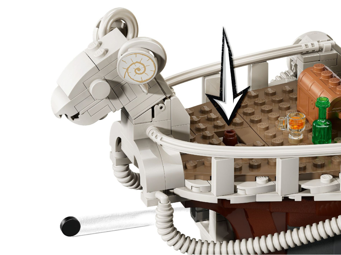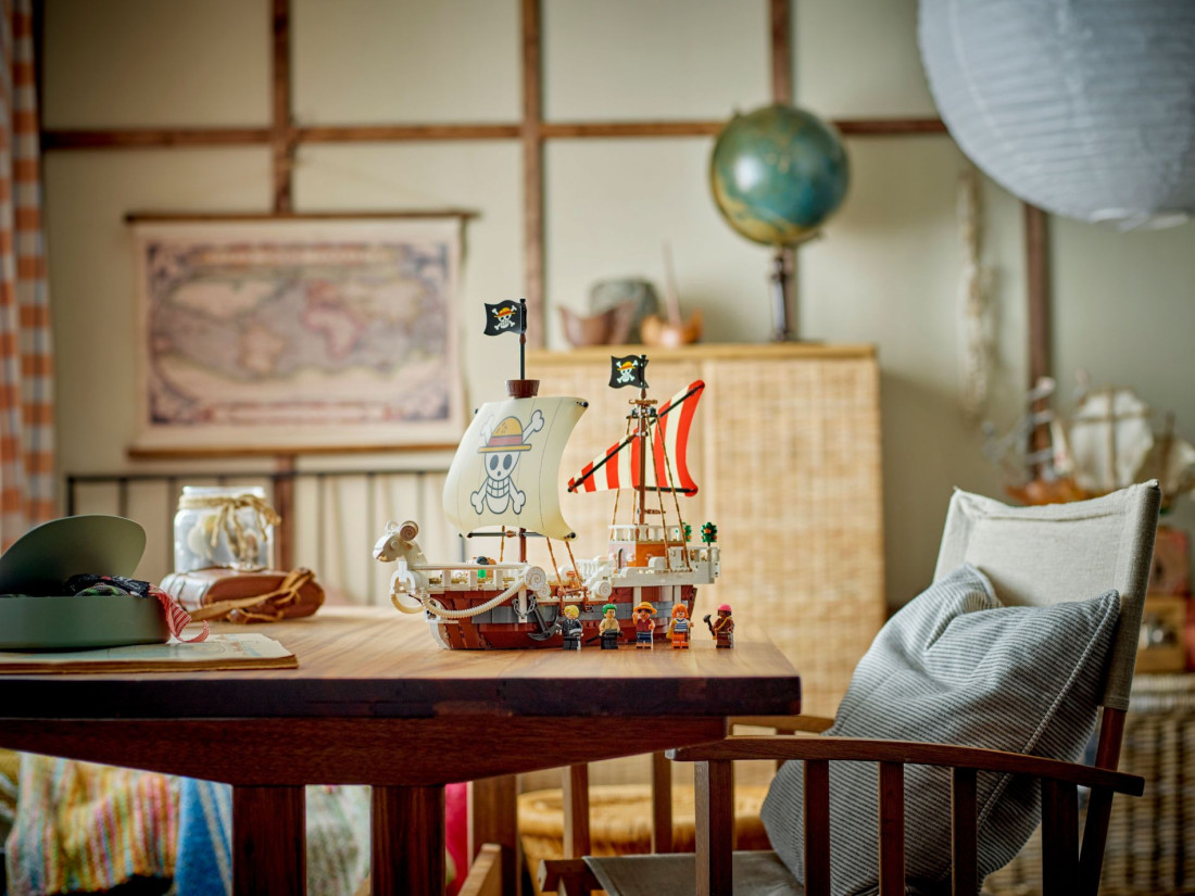 Всередині передбачені локації екіпажу: спільна каюта, кухня-камбуз зі спуском для каструль, комора та невелика майстерня для аксесуарів. На палубі та у «воронячому гнізді» вистачає місця для сцен і перестановок. У комплекті п’ять мініфігурок — Монкі Д. Луффі, Ророноа Зоро, Намі, Усопп і Санджі — а також чотири плакати «Wanted» для атмосферного оформлення. Модель заохочує як сюжетну гру, так і уважне збирання, знайомлячи будівельників із характерними деталями корабля зі всесвіту ONE PIECE.
