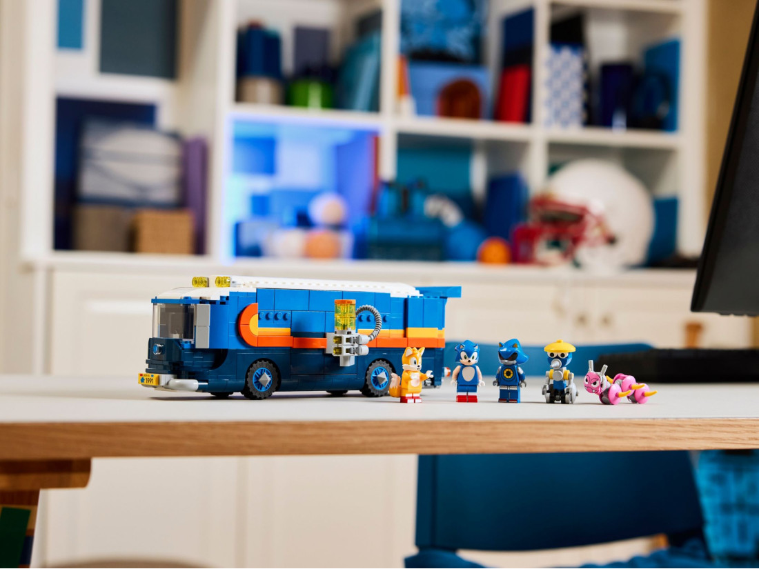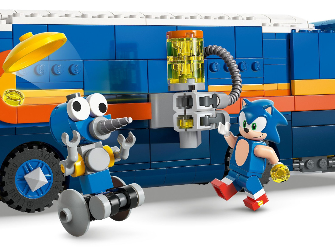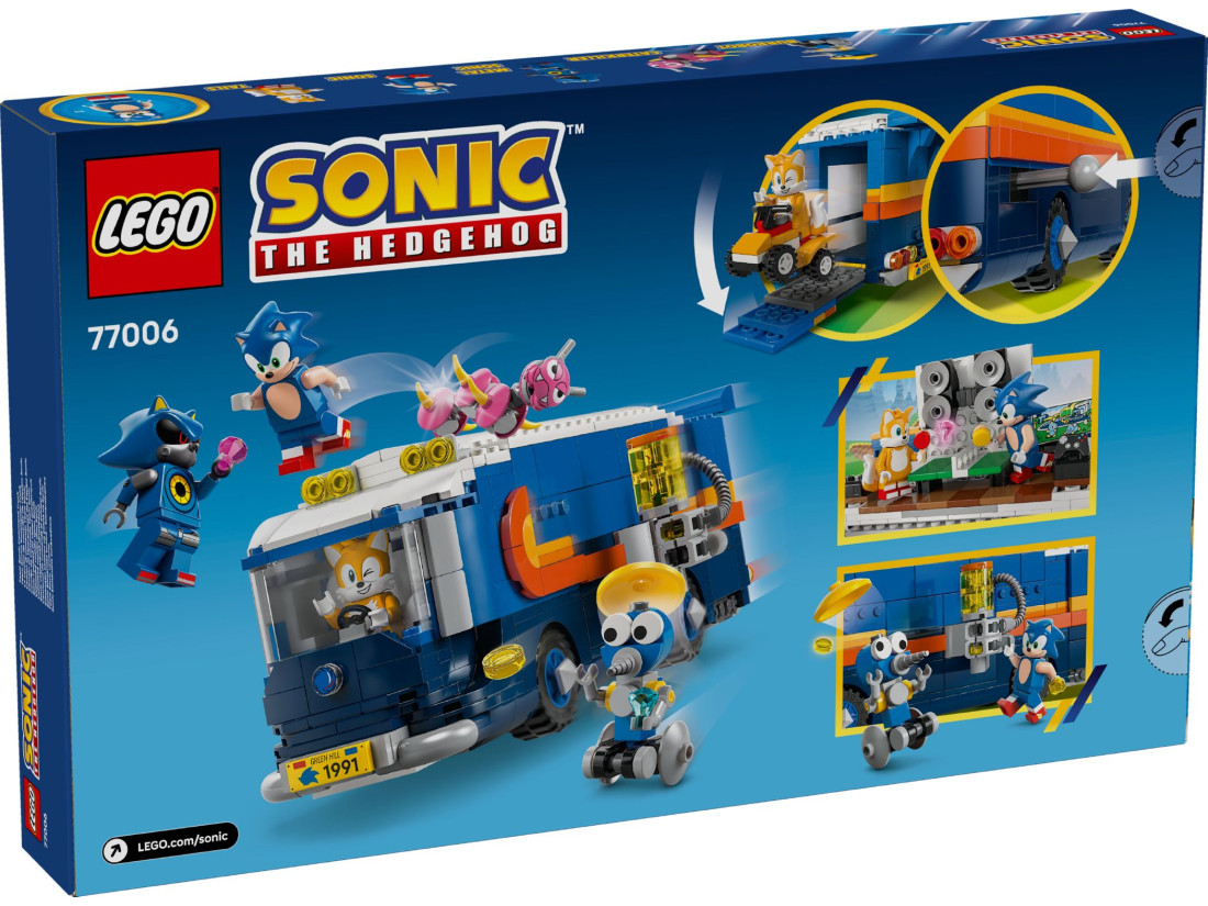 У наборі LEGO SONIC THE HEDGEHOG «Вантажівка‑штаб Команди Соніка» (арт. 77006) юні будівельники від 8 років зберуть мобільну базу героїв. Бічна панель відкривається, кабіна знімається, а по відкидній рампі міні‑квадроцикл легко виїжджає. Всередині приховано пусковий модуль, який запускає Тейлза просто з житлового відсіку.