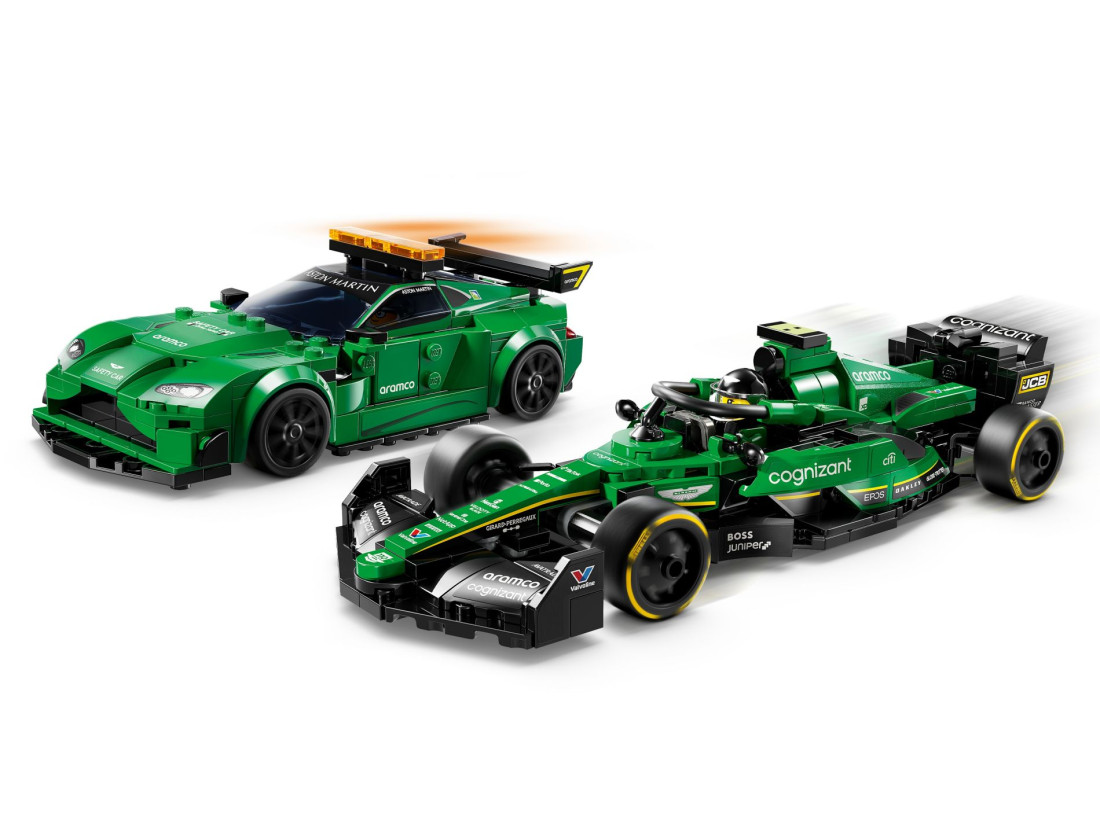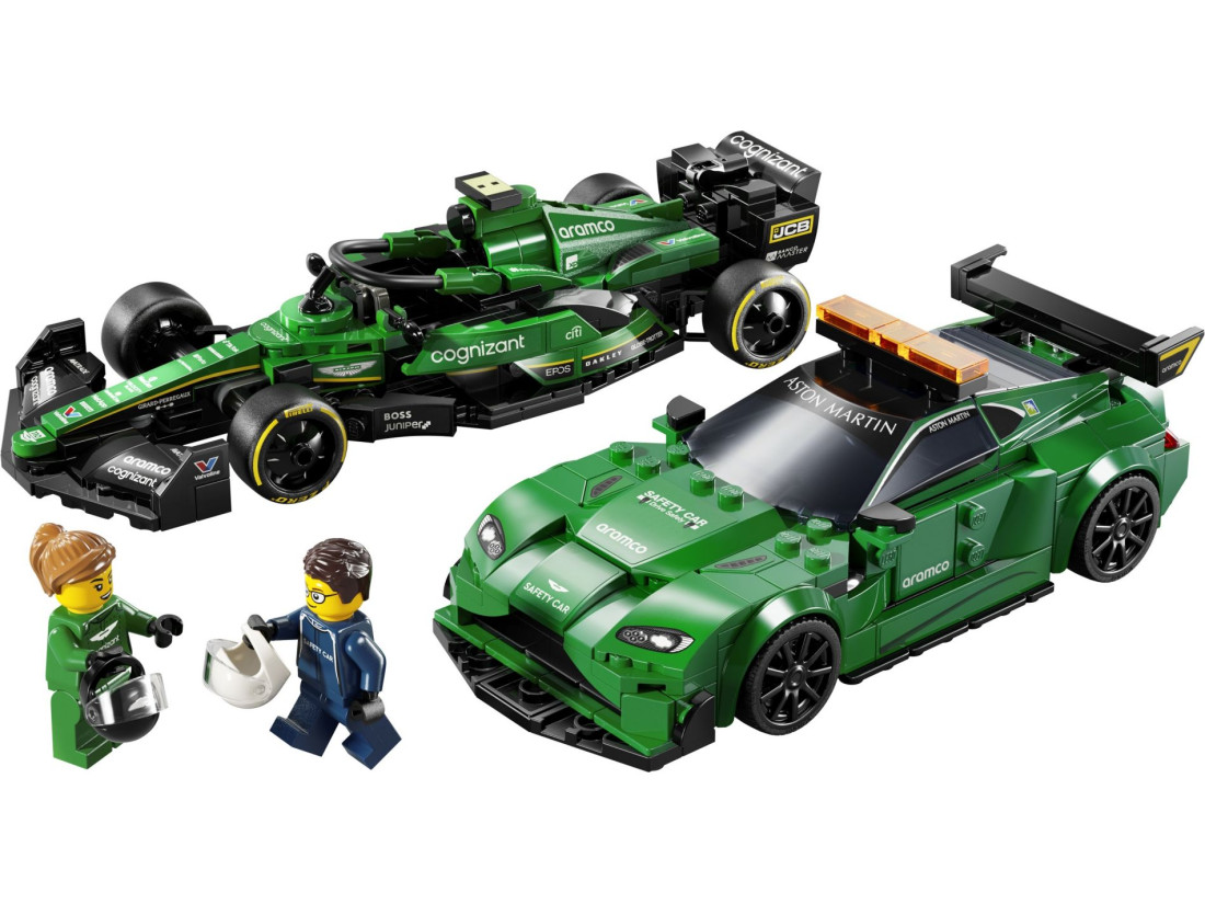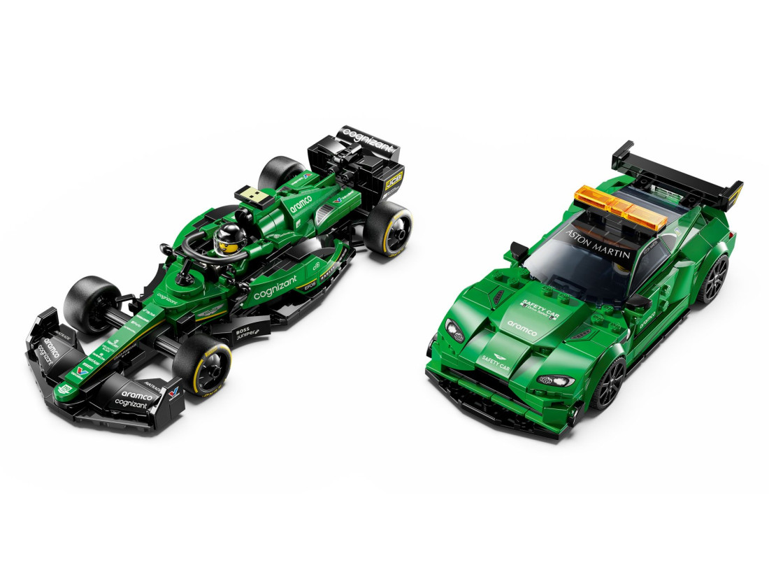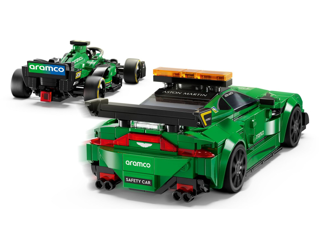Автомобіль безпеки Aston Martin розроблений з використанням автентичних деталей із реальної версії, включаючи встановлену на даху світлову планку, наклейку з кнопкою керування фарами всередині кабіни та задні ліхтарі. Іграшковий гоночний автомобіль AMR23 оснащений ореолом безпеки, заднім крилом та логотипами спонсорів. У комплект кожної машини також входить мініфігурка водія, одягненого в костюм та шолом Aston Martin, готового до гонки на трасі.