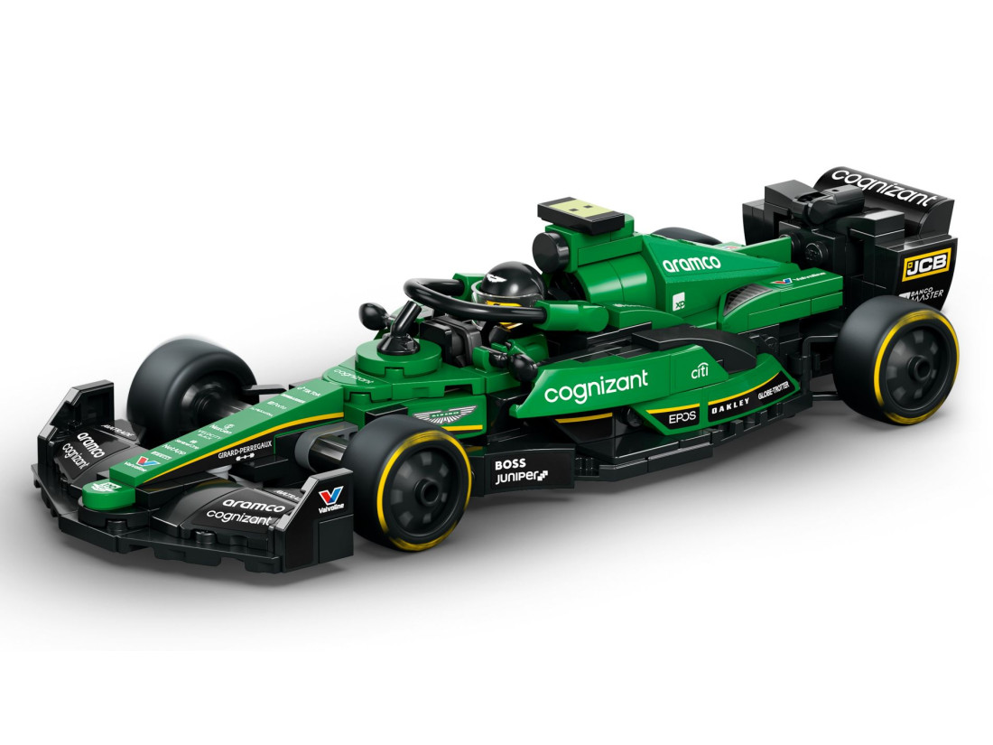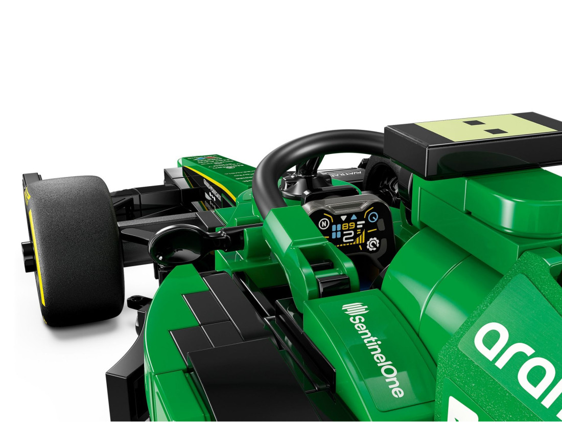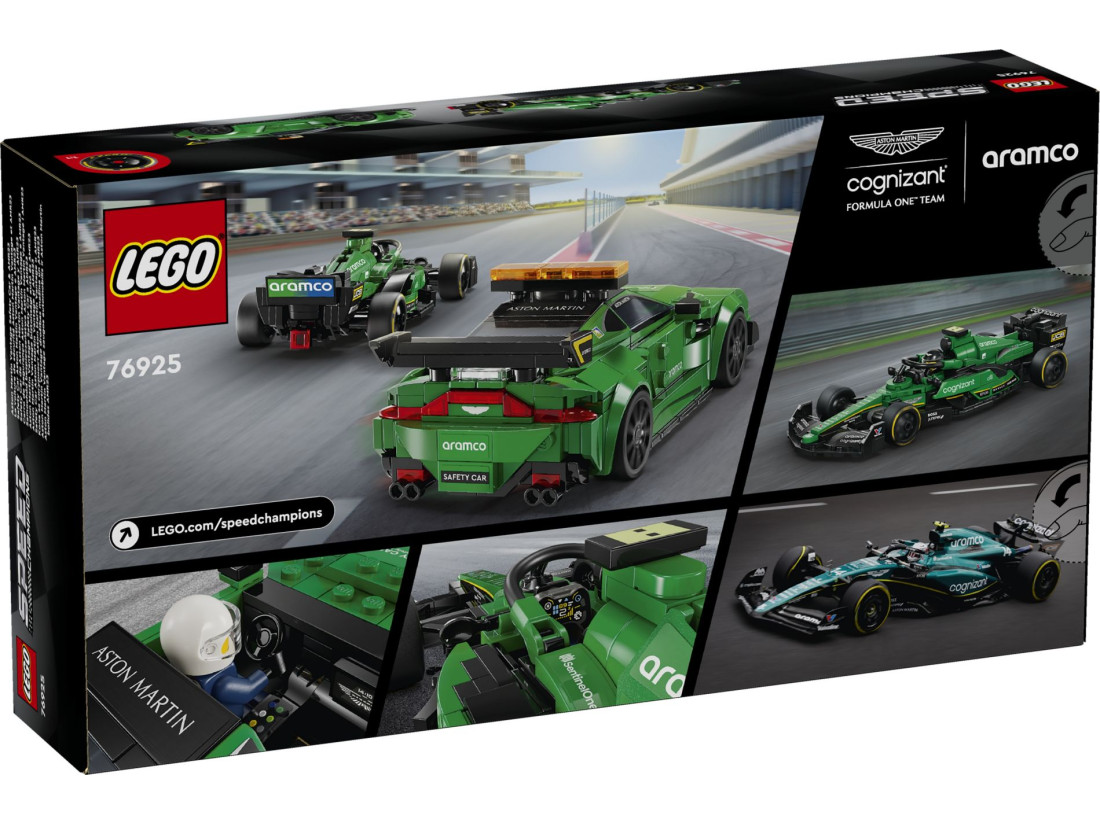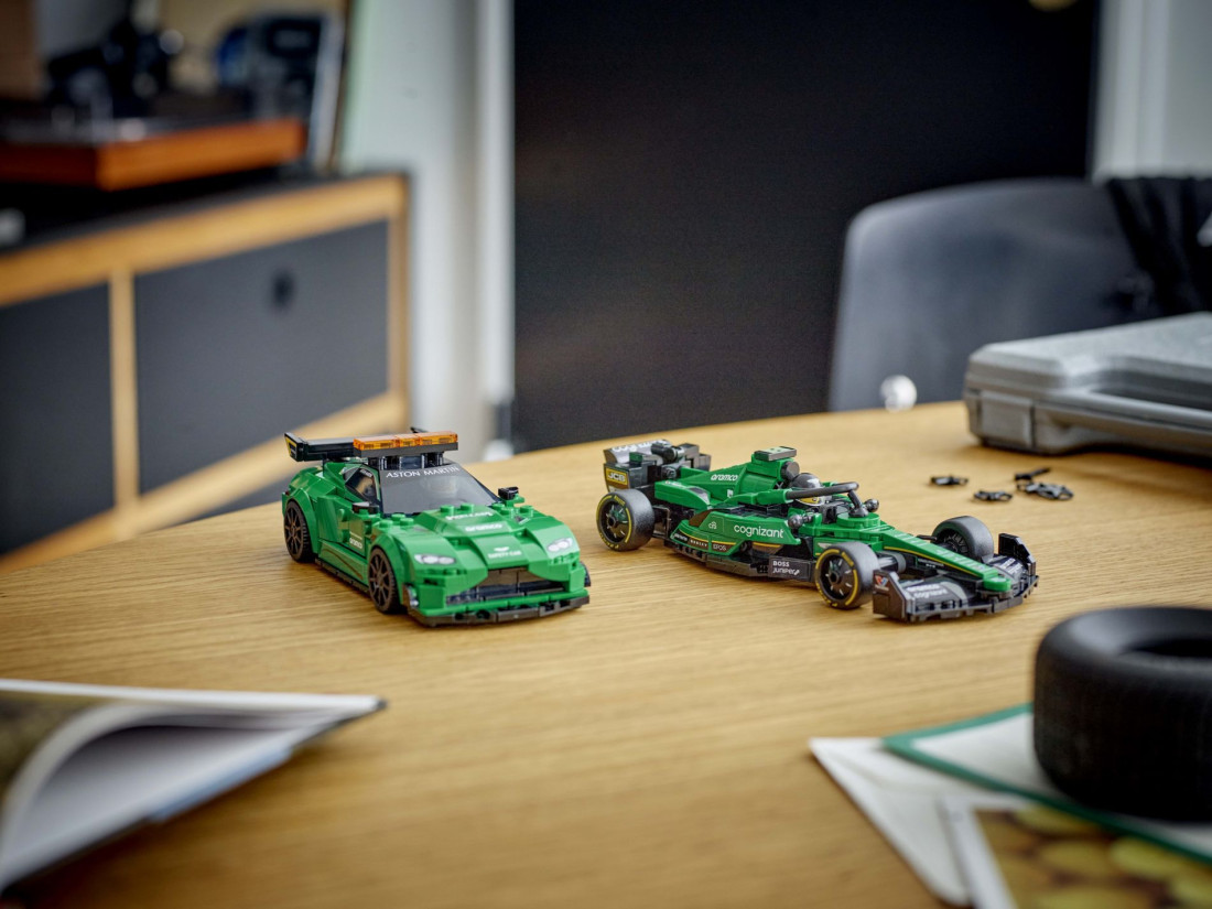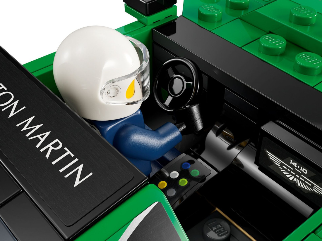 Автомобіль безпеки Aston Martin розроблений з використанням автентичних деталей із реальної версії, включаючи встановлену на даху світлову планку, наклейку з кнопкою керування фарами всередині кабіни та задні ліхтарі. Іграшковий гоночний автомобіль AMR23 оснащений ореолом безпеки, заднім крилом та логотипами спонсорів. У комплект кожної машини також входить мініфігурка водія, одягненого в костюм та шолом Aston Martin, готового до гонки на трасі.