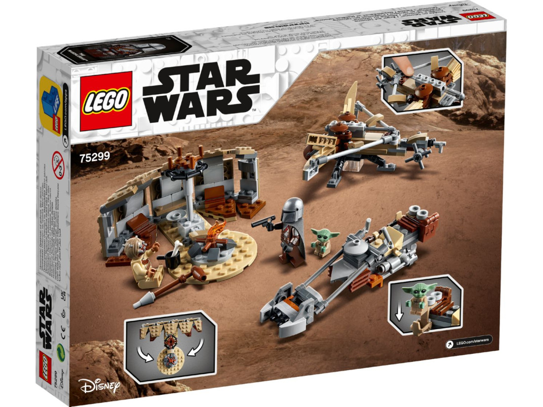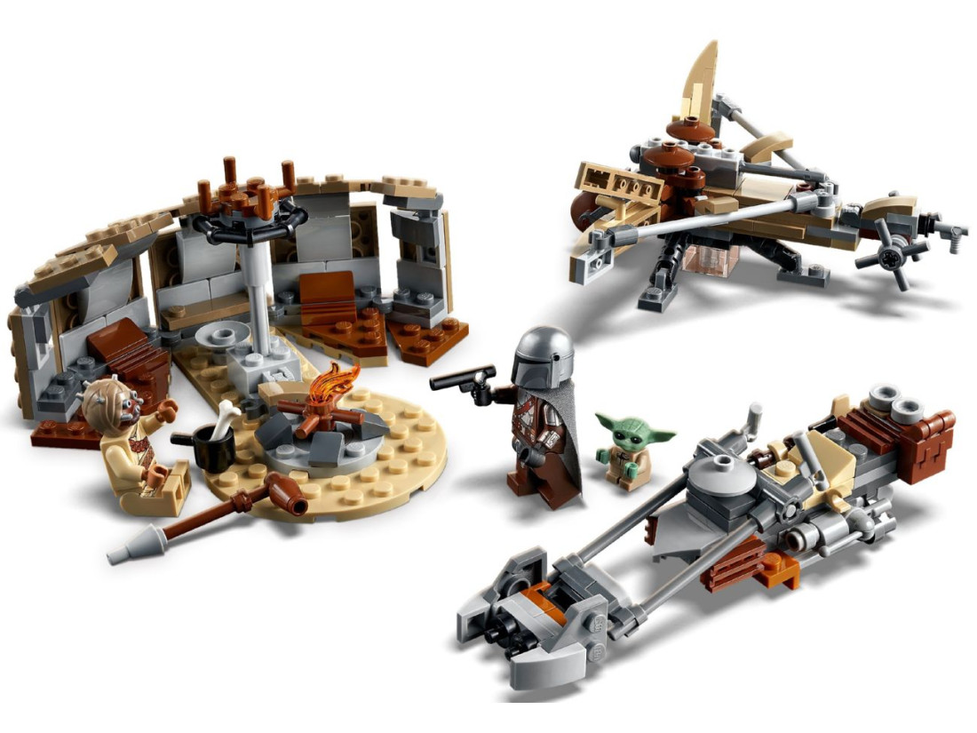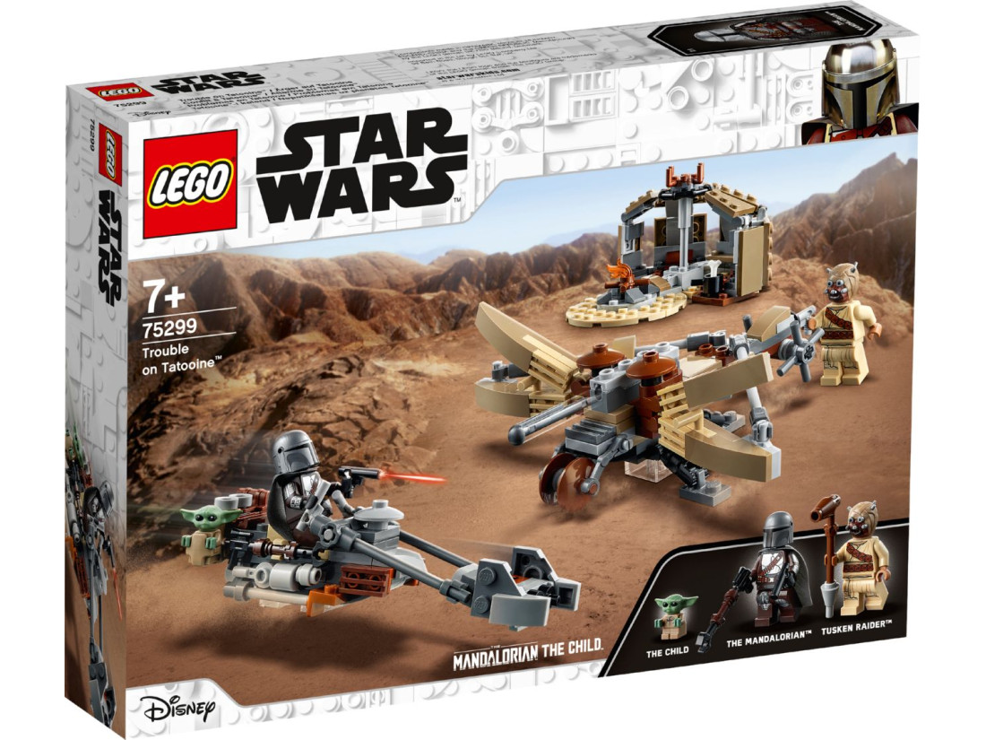 Татуїн — спекотна планета на перехресті торгових шляхів, де часто спалахують конфлікти. Набір LEGO Star Wars «Клопоти на Татуїні» (75299) переносить гру в цю локацію й пропонує зібрати ключові об’єкти: хижу тускенів, спідер-байк Мандалорця та метальну балісту. Усередині 276 деталей і три фігурки — Мандалорець, Тускенський рейдер і малюк Ґрогу. Атмосферу стоянки доповнюють вогнище й аксесуари.