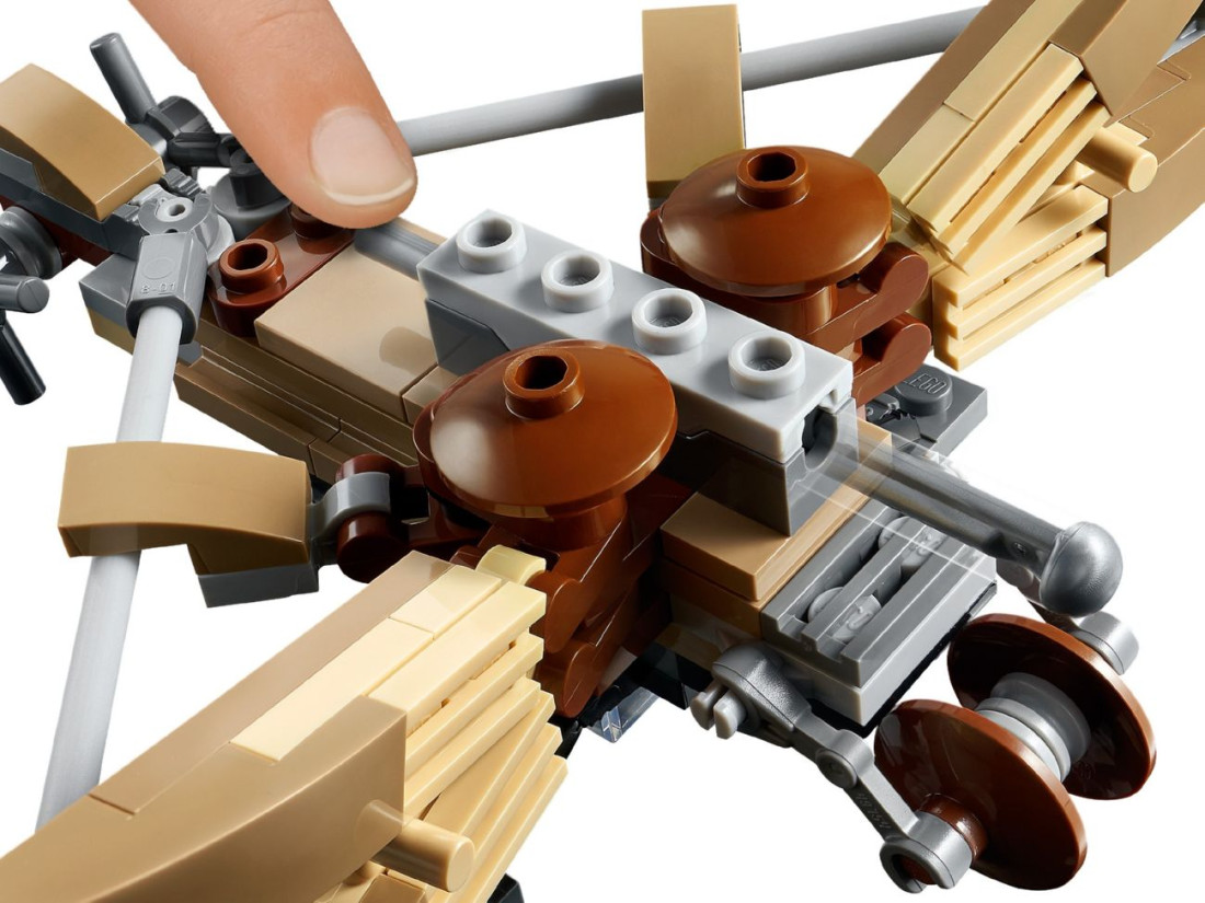 Спідер оснащений сидінням для героя та сідельною сумкою для малюка, що допомагає розігрувати подорож дюнами. Баліста з пружинним шутером підтримує динамічні сцени, а зброя персонажів дає змогу розігрувати дуелі й перемовини. Покрокові інструкції з ілюстраціями спрощують збирання для дітей від 7 років. Розміри спідера: приблизно 3 × 13 × 3 см; моделі сумісні з іншими наборами LEGO Star Wars.