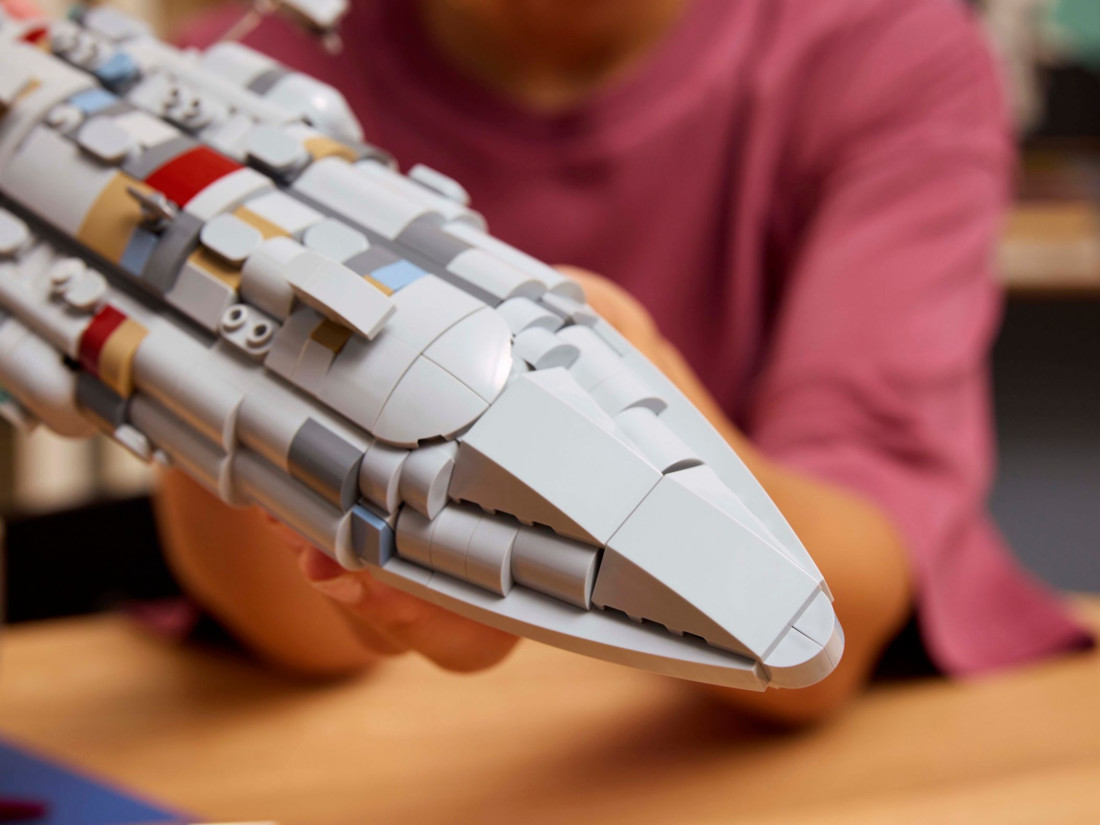 На додачу до основного корабля передбачено збірний медичний фрегат Nebulon‑B, який можна розмістити поруч, створюючи цілісну діораму. Для стійкої демонстрації використовується підставка з табличкою, що дозволяє вигідно представити модель на полиці або робочому столі. Габарити зібраного крейсера: висота 14 см, довжина 33 см, ширина 14 см. Серія LEGO Star Wars, артикул 75405.