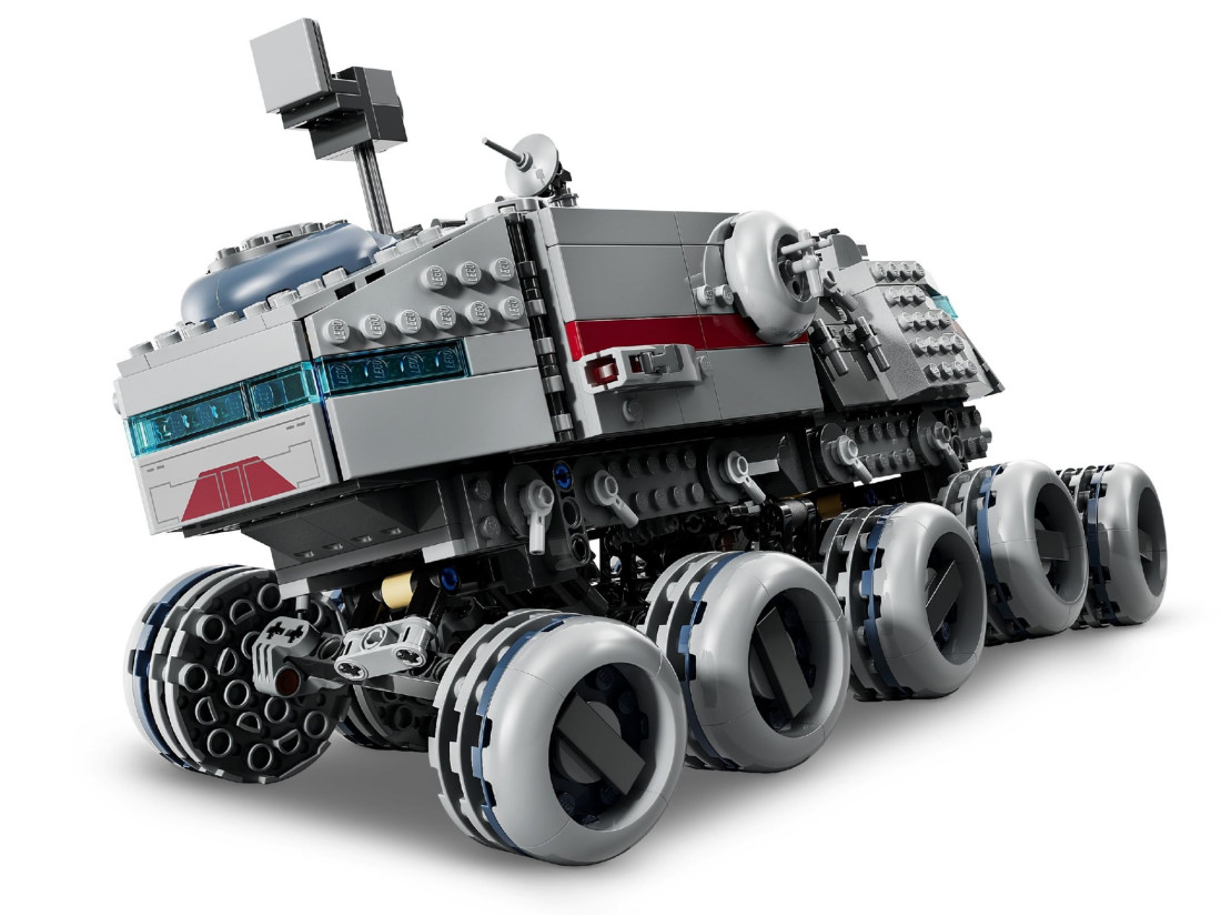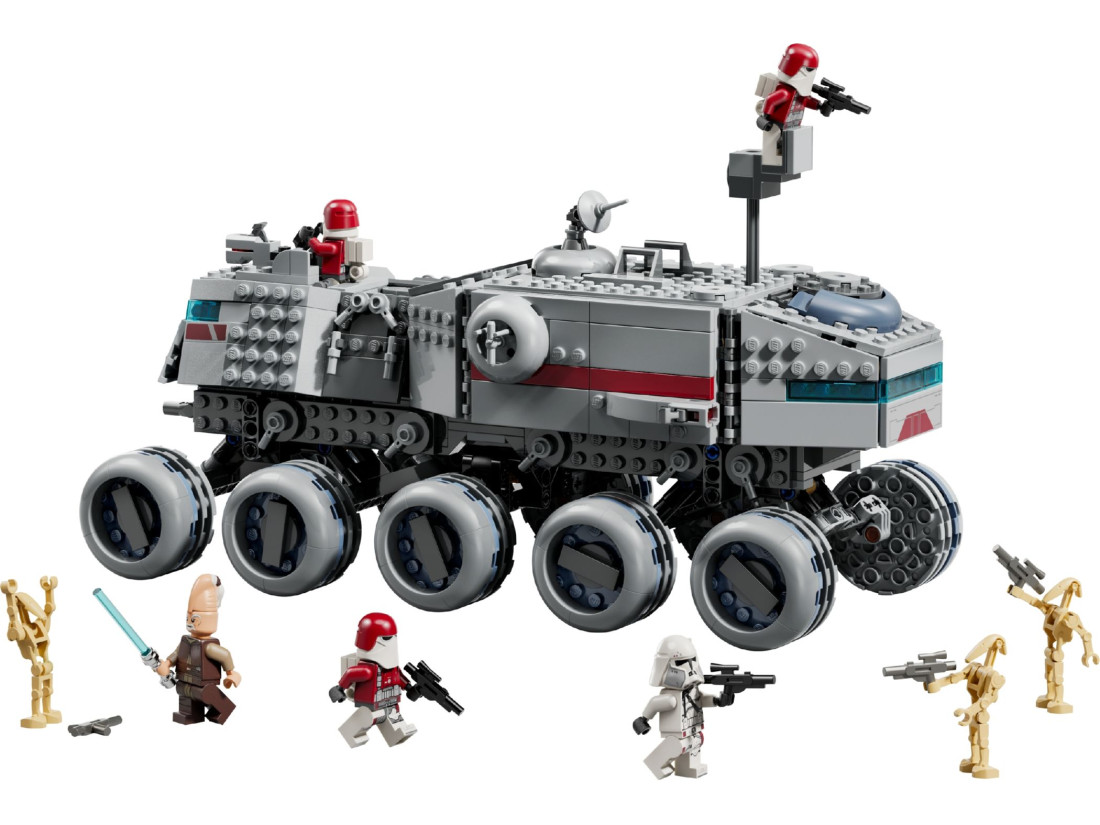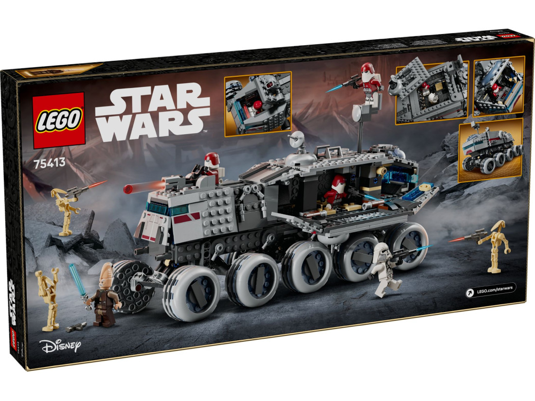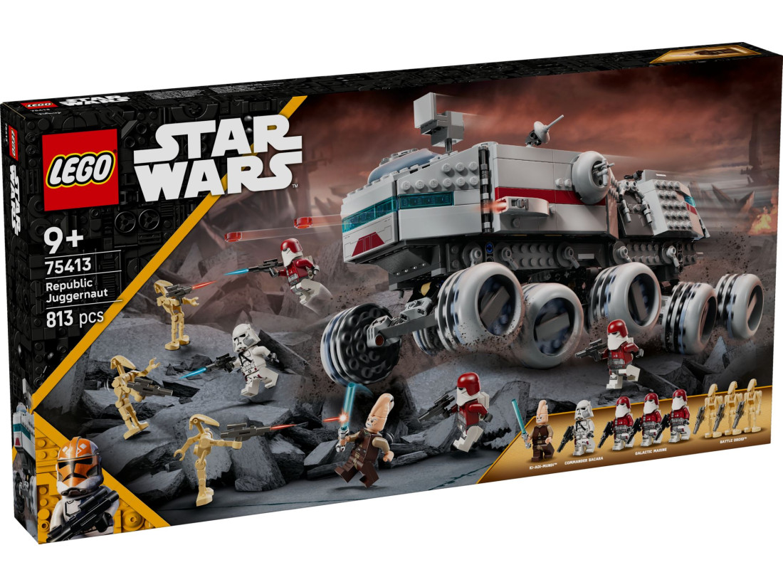 Набір LEGO STAR WARS «Джаггернаут Республіки» (75413) переносить у епоху Війн клонів і пропонує зібрати масивний 10‑колісний броньований транспорт. Модель для дітей від 9 років оснащена керуванням нахилом: нахиляйте корпус, щоб спрямовувати машину та маневрувати в уявних битвах. Завдяки відкидним бічним панелям і знімному даху можна легко зазирнути всередину: у передній і задній кабінах передбачені місця для пілотів, у центрі — відсік зі стійками для спорядження, зверху — оглядова вежа, а позаду — турель.