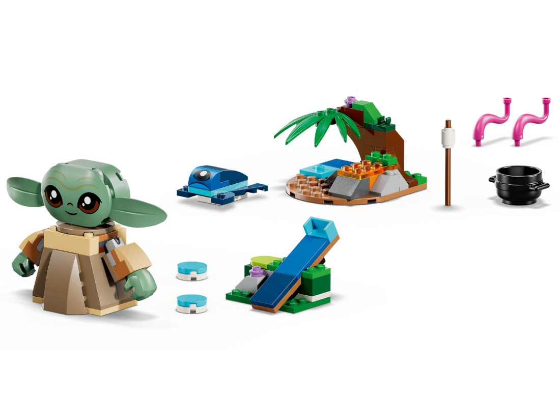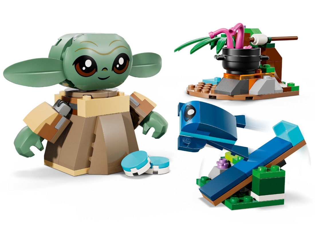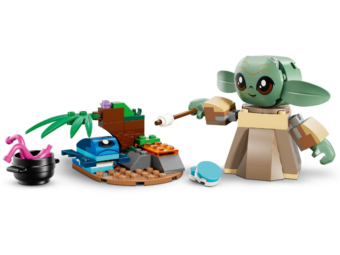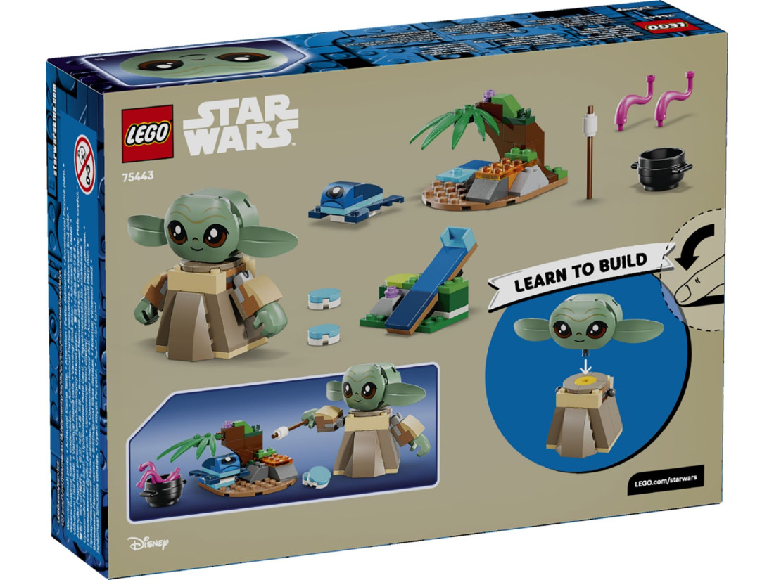 Конструктор LEGO Star Wars «Дім Ґрогу» (75443) для дітей від 4 років знайомить із всесвітом «Зоряних війн» і серіалом The Mandalorian через просте складання та сюжетну гру. Центральний елемент — збірна фігурка Малюка з поворотною головою, рухомими руками та долонями. Ігрову зону доповнюють вогнище з казанком і невеликі елементи для сцен біля вогнища. У комплекті паличка із зефіром, щупальця та два сині макарони; один можна помістити всередину фігурки. Є також жаба з планети Сорган із катапультою.