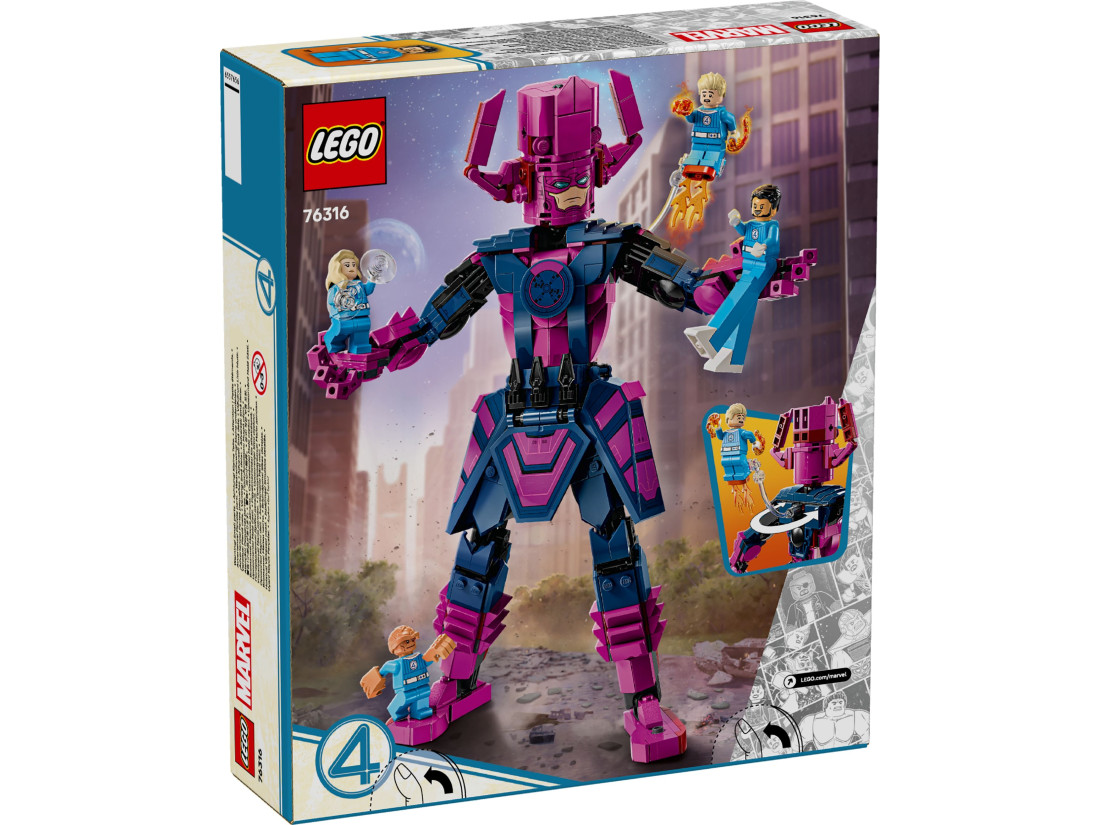 Ігрові можливості підкреслюють впізнавані сили персонажів: у Людини‑Смолоскипа є елементи полум’я та прозора опора для «польоту», Невидима Жінка створює енергетичні щити, у Річи масивні руки для потужних ударів, а у Містера Фантастіка передбачені висувні секції для ніг. Збирання супроводжується зрозумілими 3D‑інструкціями в застосунку LEGO Builder з функціями масштабування, обертання та позначення етапів. Висота фігурки Ґалактуса — близько 28 см.