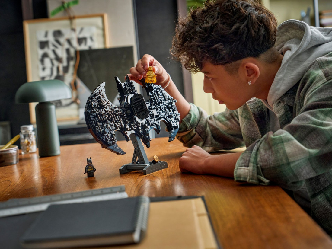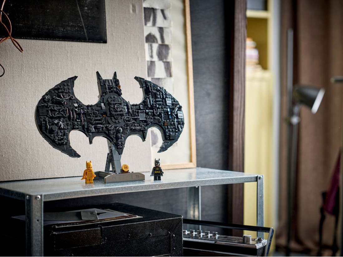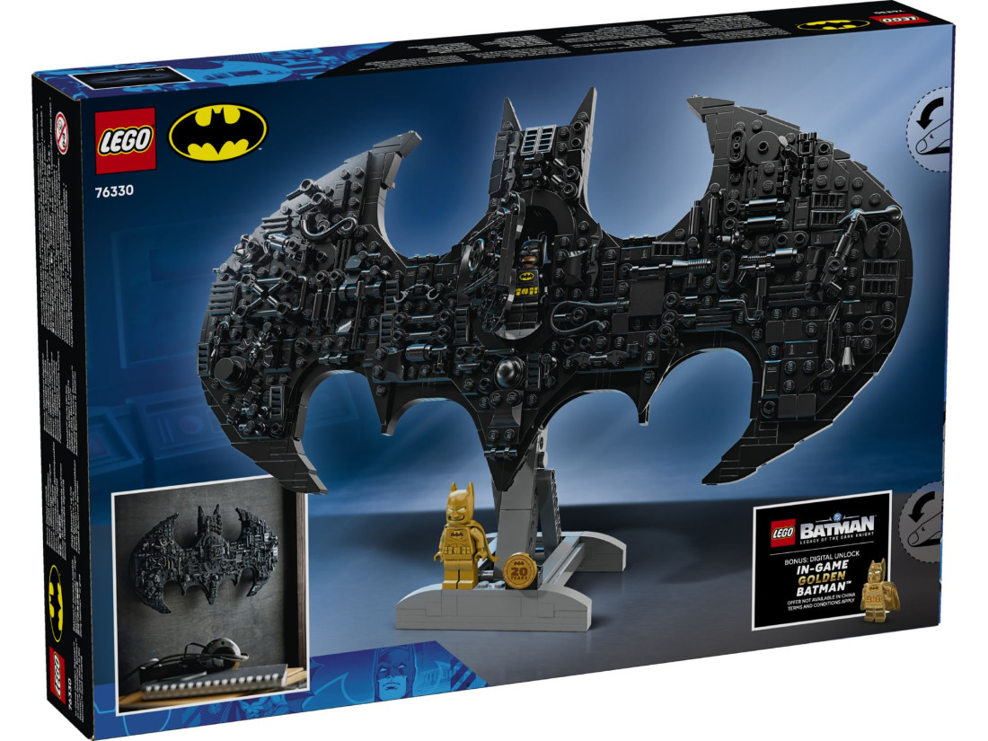 Комплектація включає збірний логотип із декоративним оздобленням, золоту мініфігурку Batman™, ювілейну монету в золотому виконанні, класичну мініфігурку Batman™, а також знімні аксесуари — Batarang™ і молот Harley Quinn™. Із 678 елементів збирається композиція розмірами близько 23 см заввишки, 36 см завширшки і 9 см завглибшки. Модель призначена для наочної експозиції в кімнаті, кабінеті чи ігровій зоні й органічно вписується в колекції на тему Готема.