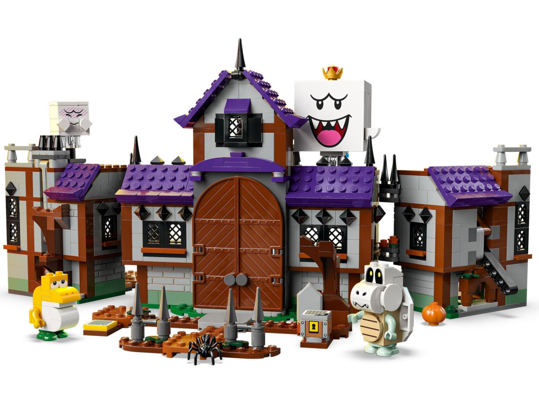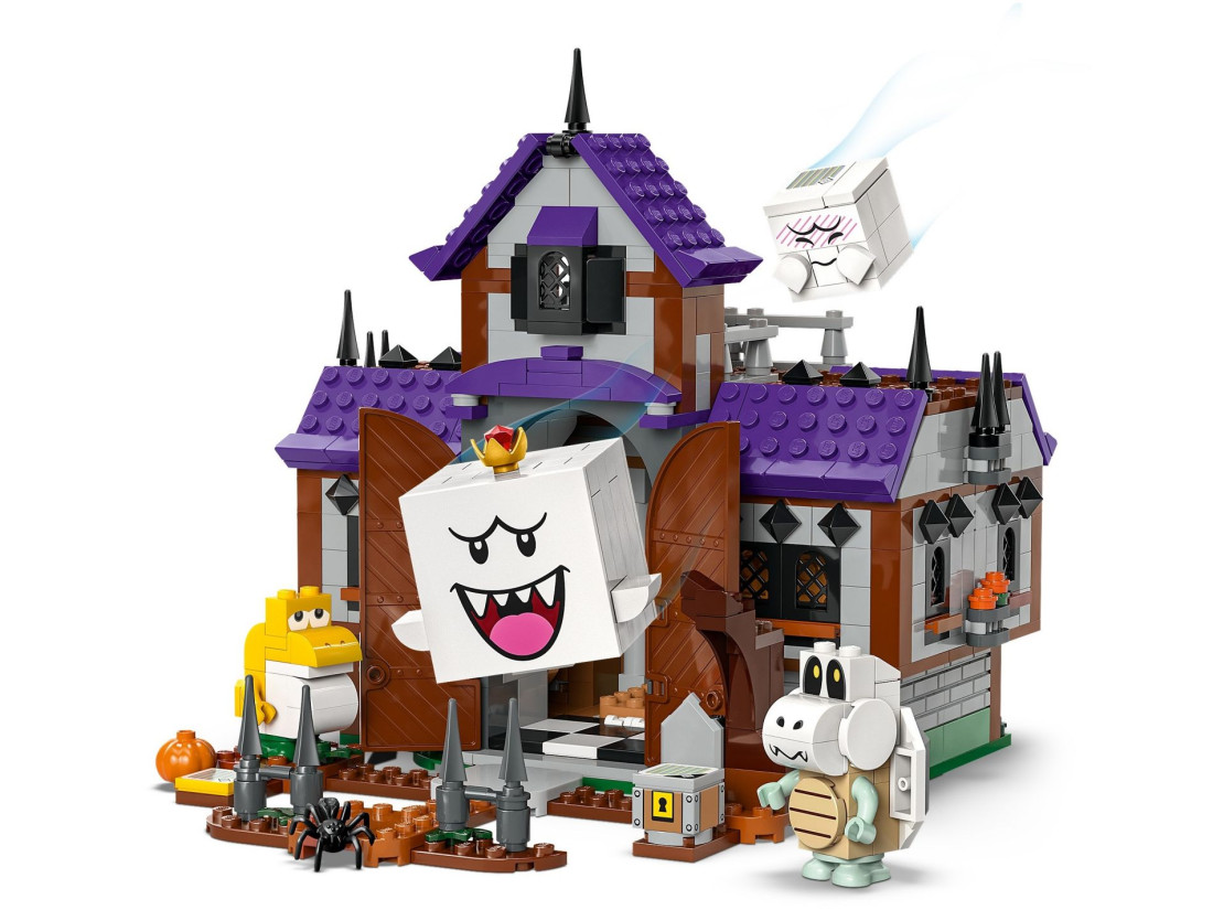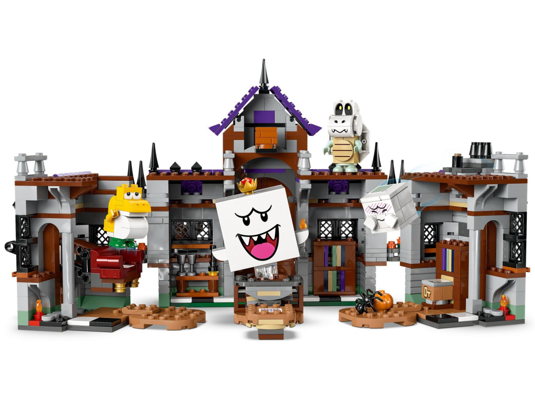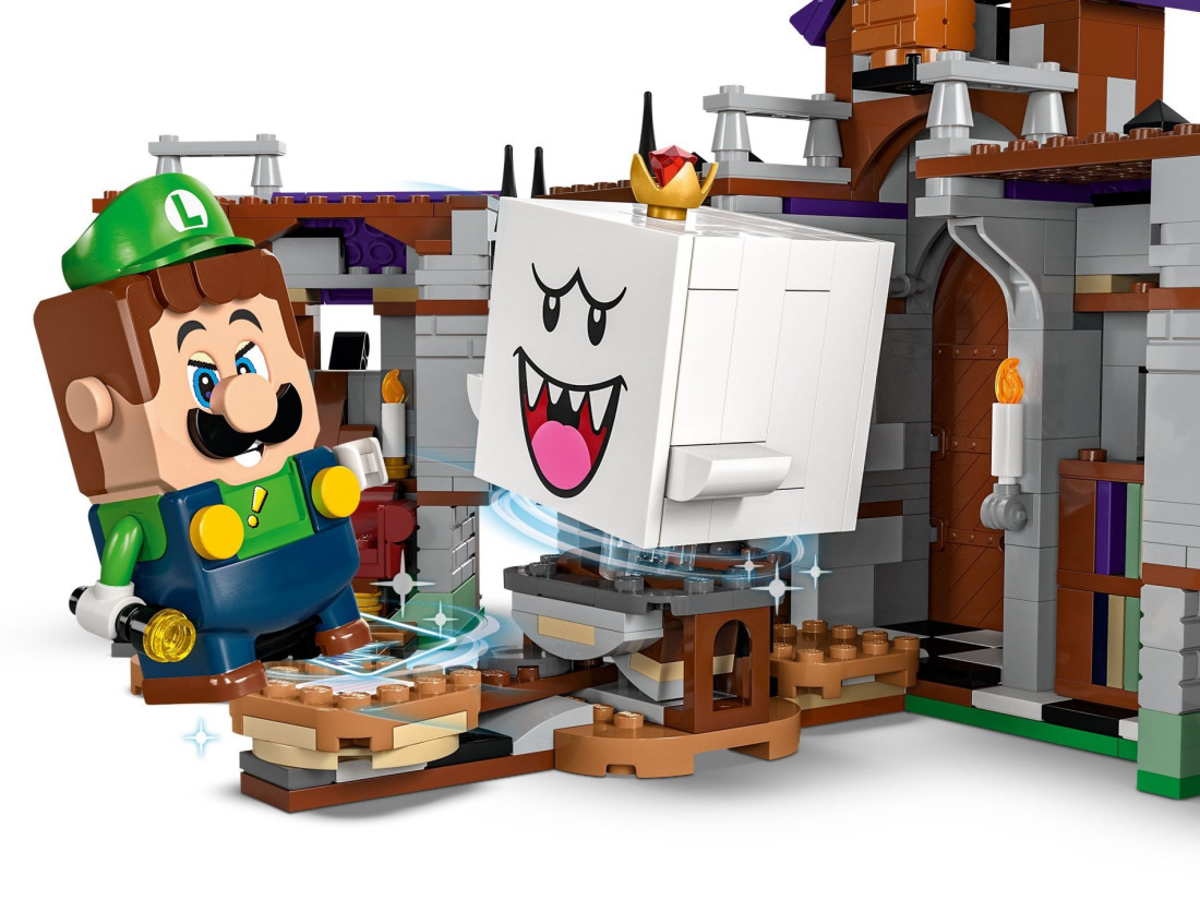 Додайте фігурку LEGO® Mario™, LEGO® Luigi™ або LEGO® Peach™ (не включені) для інтерактивної гри. Допоможіть їм збирати нагороди з блоків монет, скринь та ключів, переможіть Бу і Суху кістку, скиньте Короля Бу зі столу у дворі і зрештою відкрийте скриню зі скарбами.