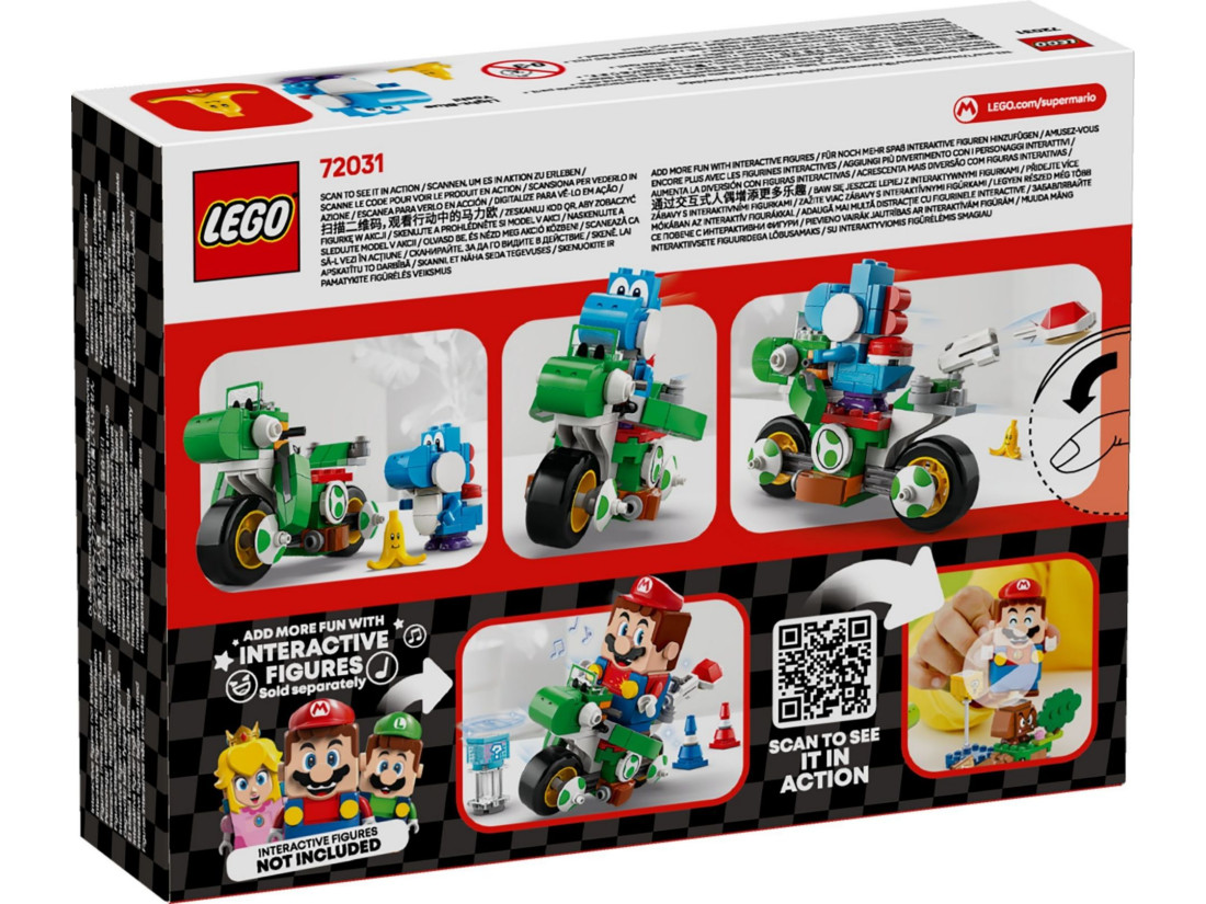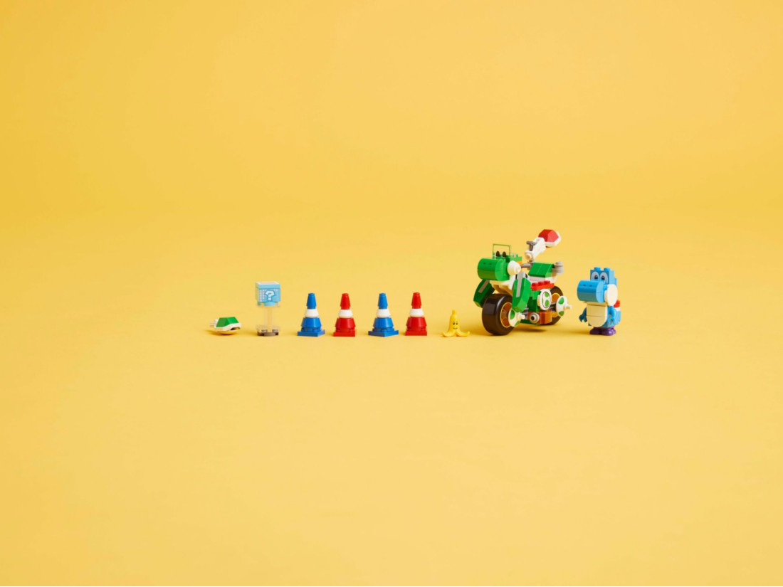 Діти можуть посадити Блакитного Йоші на байк і маневрувати між 4 дорожніми конусами, запускати снаряди та об'їжджати кумедний елемент Банана з обличчям. Інтерактивна гра стає можливою при додаванні фігурок LEGO® Mario™, LEGO® Luigi™ або LEGO® Peach™ (з наборів 71439, 71440 або 71441 – продаються окремо). Геймерів порадують звукові та візуальні ефекти Mario Kart™ та цифрові предмети з коробки з предметами.