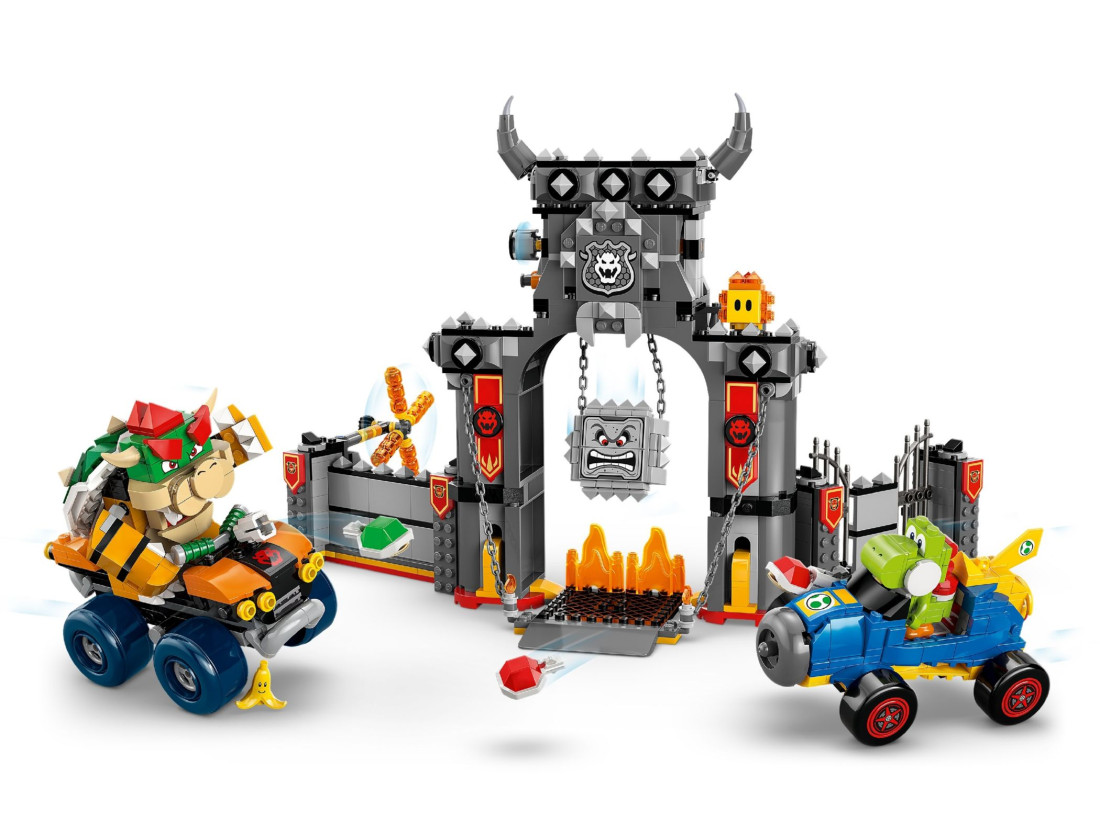 Пориньте у світ перегонів Mario Kart з набором LEGO SUPER MARIO «Замок Боузера» (72039) для дітей від 9 років. Тут зібрана траса у стилі фортеці антагоніста з розсувними стінами та вогняною штангою, що обертається, а також інтерактивними пастками: ділянками, що руйнуються, падаючим Твомпом і бульбашкою лави, що перекидається. У комплект входять фігурки Боузера, Йоші, Твомпа та Бульбашки лави, плюс елемент банана. Для заїздів передбачені квадроцикл Боузера та карт Йоші Mach 8 з функціями дрифту та запуску снарядів.