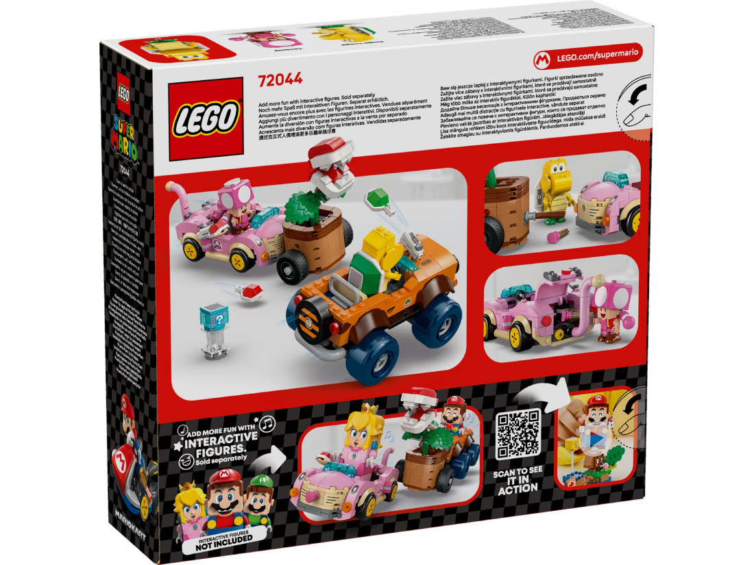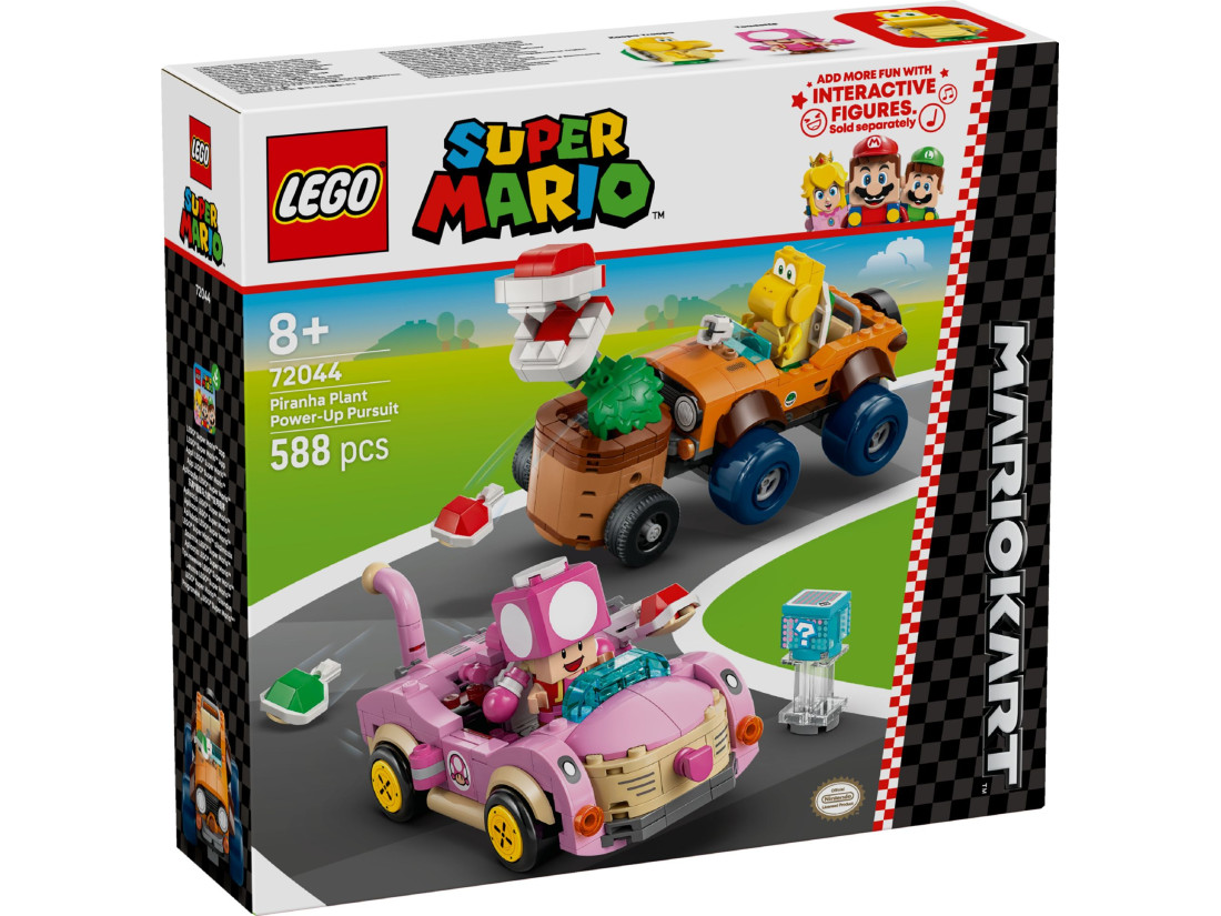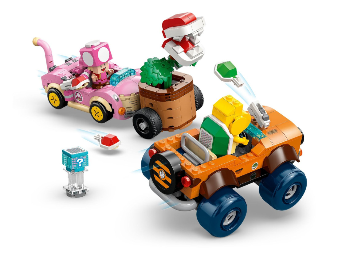 Набір LEGO SUPER MARIO «Переслідування рослини‑піраньї» (72044) переносить перегони з Mario Kart у світ цеглинок. У коробці — збірні карти Cat Cruiser для Тоадетти та Tanooki Kart для Купи‑Трупи з керованим дрифтом і механізмом запуску мушель. Фігура Рослини‑піраньї кріпиться до будь-якої карти, а шарнірні з’єднання дозволяють нахиляти й повертати «монструозну» голову, влаштовуючи атаки прямо на трасі.