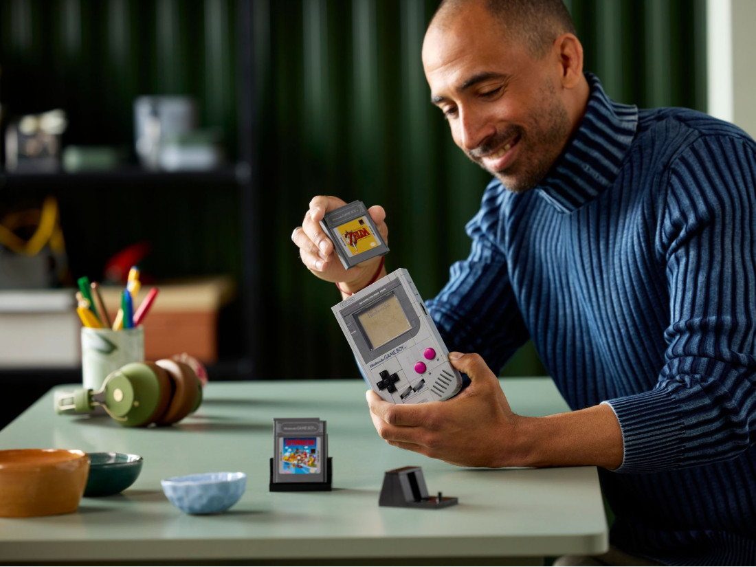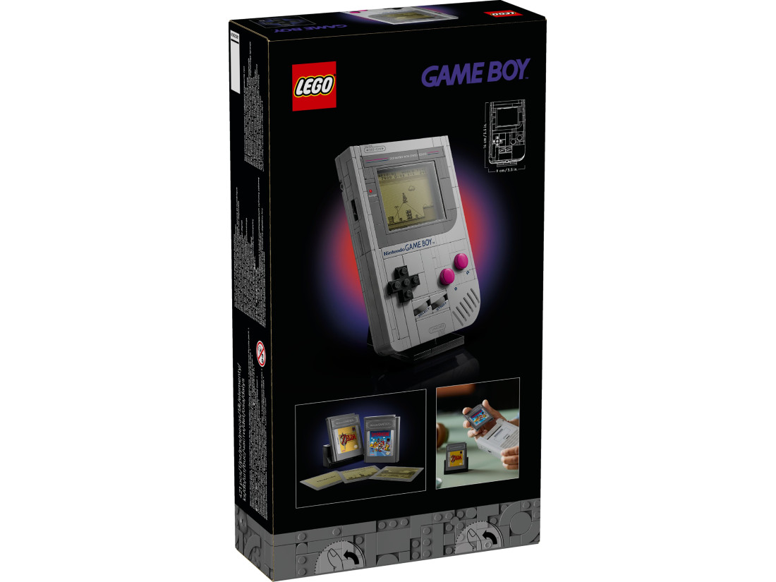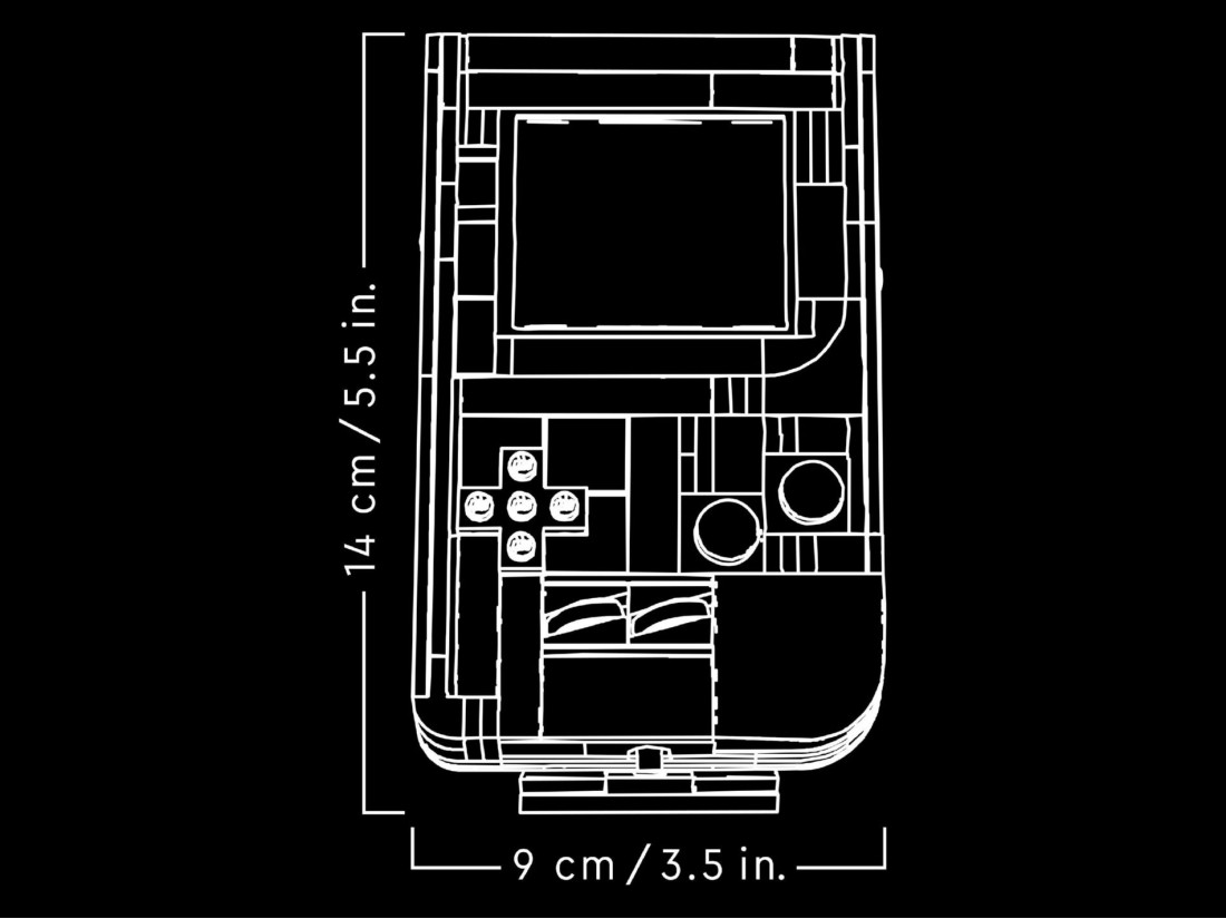 Реалізовані характерні елементи: натискні кнопки A та B, хрестовина (+Control Pad), SELECT/START, регулятори контрастності та гучності, слот для картриджа. У набір входять два збірні «картриджі» зі сценами The Legend of Zelda: Link's Awakening і Super Mario Land і прозорі панелі для варіацій дисплея. У коробці – інструкції; у програмі LEGO Builder доступні покрокові 3D-підказки. Габарити моделі: приблизно 14×9×3 см; для розміщення передбачено підставку.