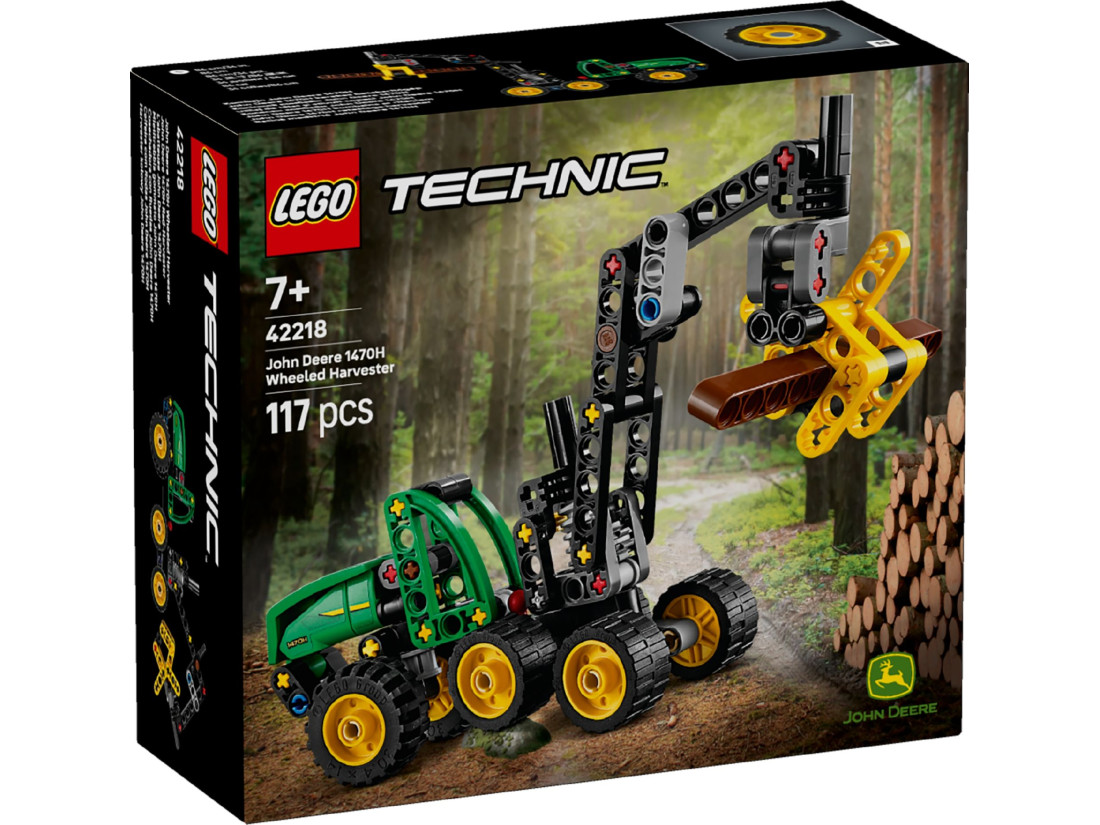 LEGO Technic Колісний комбайн John Deere 1470H (42218) — деталізована лісозаготівельна машина для дітей від 7 років, яким цікаві механіка та реальні технології. У харвестера рухома стріла з поворотом на 180° і робочий захват, що піднімає, опускає та утримує колоду. Рульове керування виконано через шарнір посередині рами, а гойна підвіска допомагає долати нерівні ділянки ігрового «лісу». Набір спонукає експериментувати з маневрами та розігрувати робочі сцени.