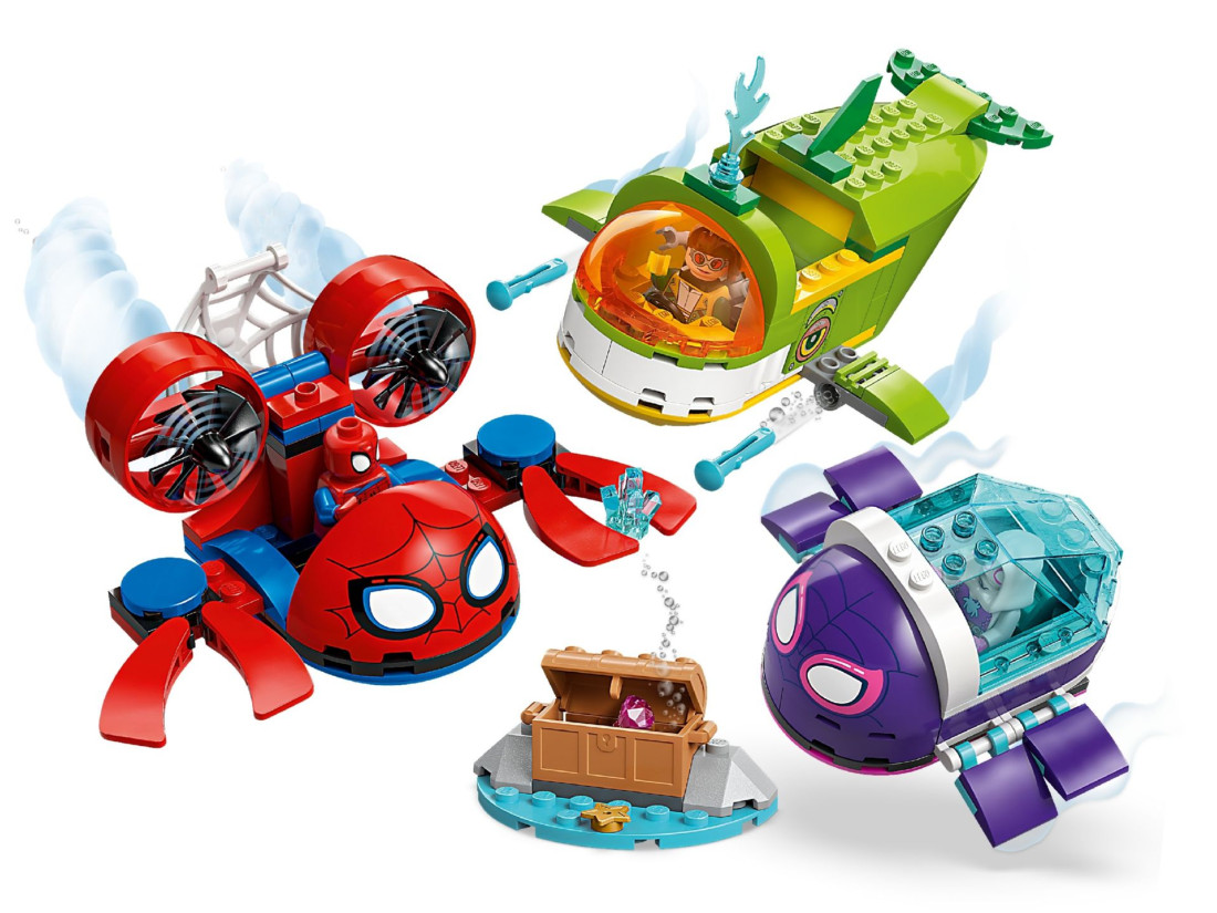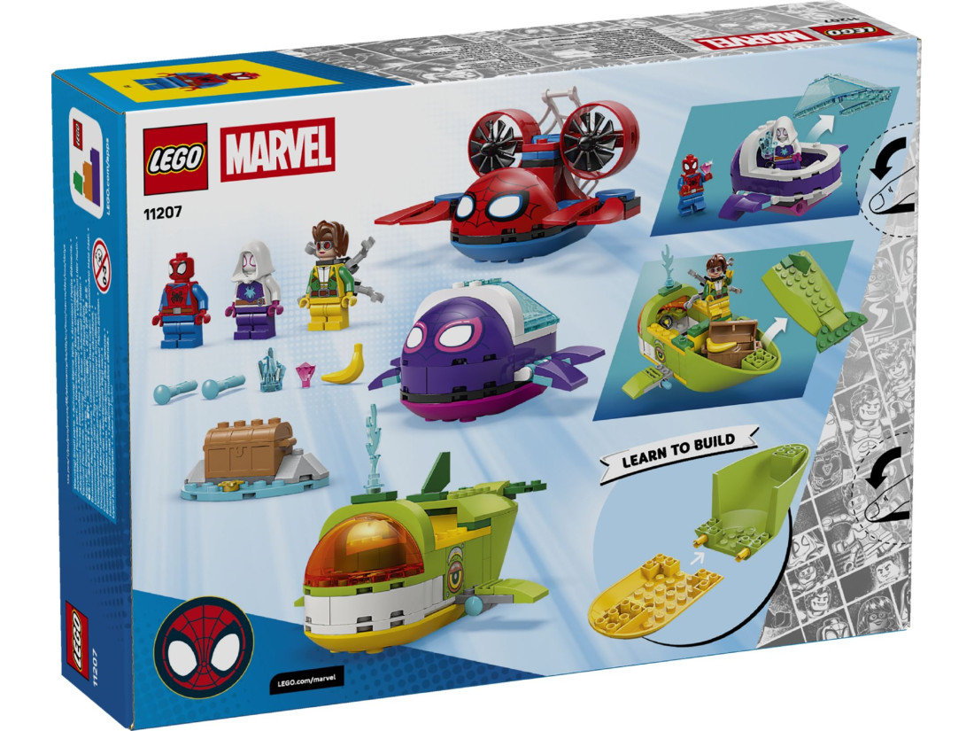LEGO MARVEL Человек-паук: Подводные аппараты (11207) — набор для детей от 4 лет по мотивам мультсериала «Spidey and His Amazing Friends». Малыши отправятся на морское дно вместе с любимыми героями: в коробке есть минифигурки Спайди, Ghost-Spider и Доктора Осьминога. Для игры предлагаются три забавных субмарины со своим характером: подлодка-краб с большой паутиной-ловушкой, подлодка-черепаха с прозрачным открывающимся панцирем и подлодка-кит с шутерами на плавниках и тайником для клада.