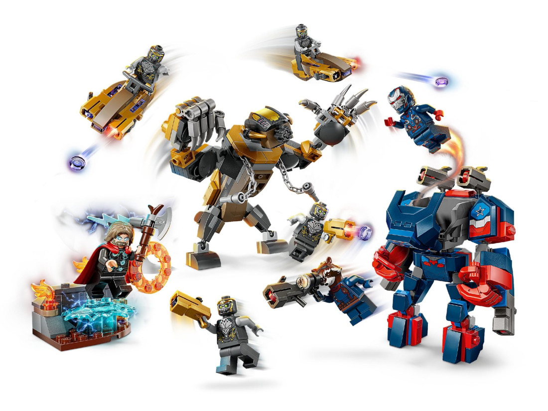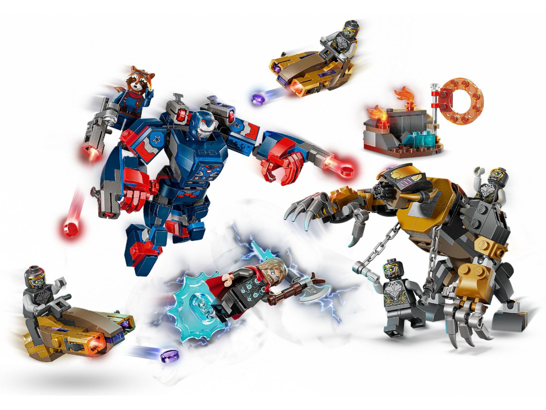 Две сборные фигуры задают тон схватке: Железный Патриот MK2 оснащён четырьмя шипомётами, а горилла Читаури добавляет массивности и силы противника. Семь минифигурок расширяют возможности постановки сцен: Тор со Штормбрейкером, Ракета с крупным шипомётом, Железный Патриот MK2 и четыре бойца Читаури, двое из которых вооружены золотыми шипомётами. Для динамики предусмотрены два реактивных скутера и платформа с местом для запаса шипов. Всего 373 детали; высота сборной модели Железного Патриота — около 10 см, длина гориллы Читаури — около 10 см. Набор относится к серии LEGO MARVEL и совместим с 76323 для расширения сражений.