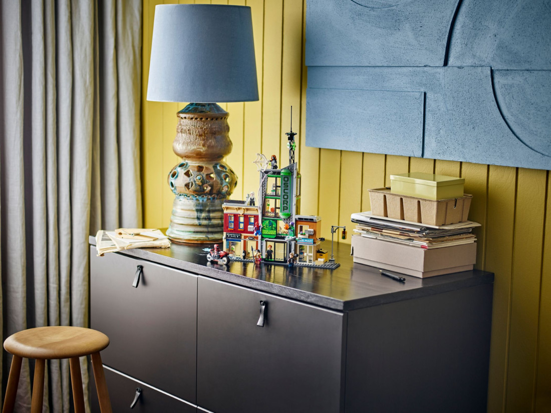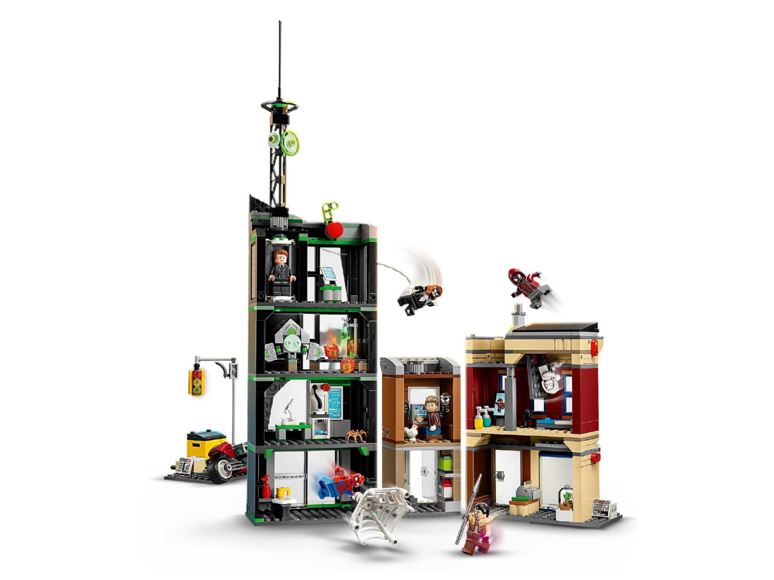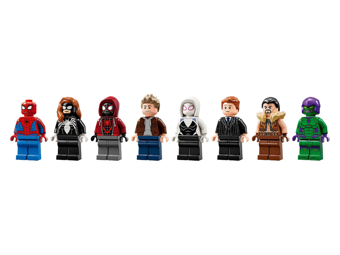 В набор входят восемь минифигурок: Человек-паук, Женщина-паук, Майлз Моралес (с мотоциклом), Призрачный Паук, Эдди Брок, Норман Озборн, Крэйвен-Охотник и Зелёный Гоблин с глайдером. Сцены дополняют аксессуары — элементов паутины, оружие и подставки для выразительных поз. Внутри предусмотрены детализированные комнаты, включая лабораторию OSCORP, а также городские витрины. Габариты собранной улицы: высота 46 см, ширина 38 см, глубина 11 см.