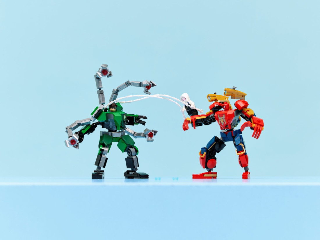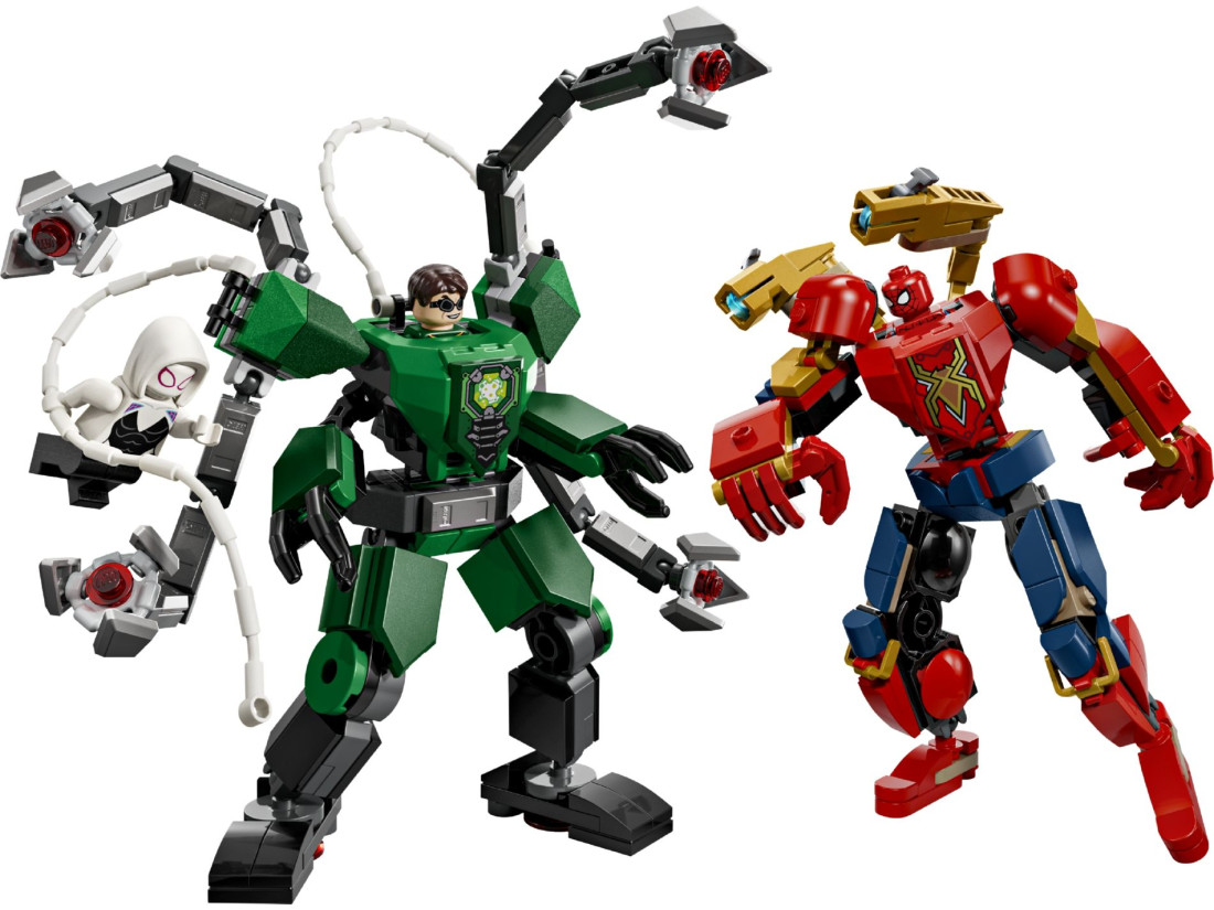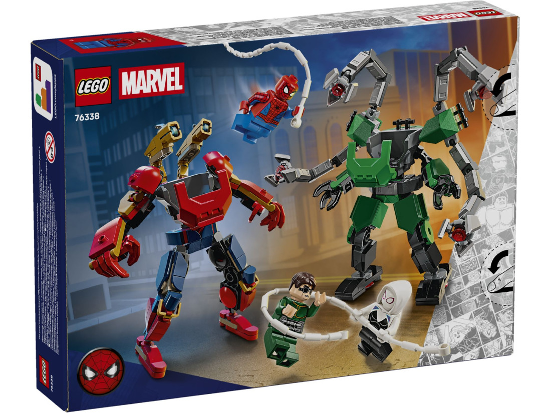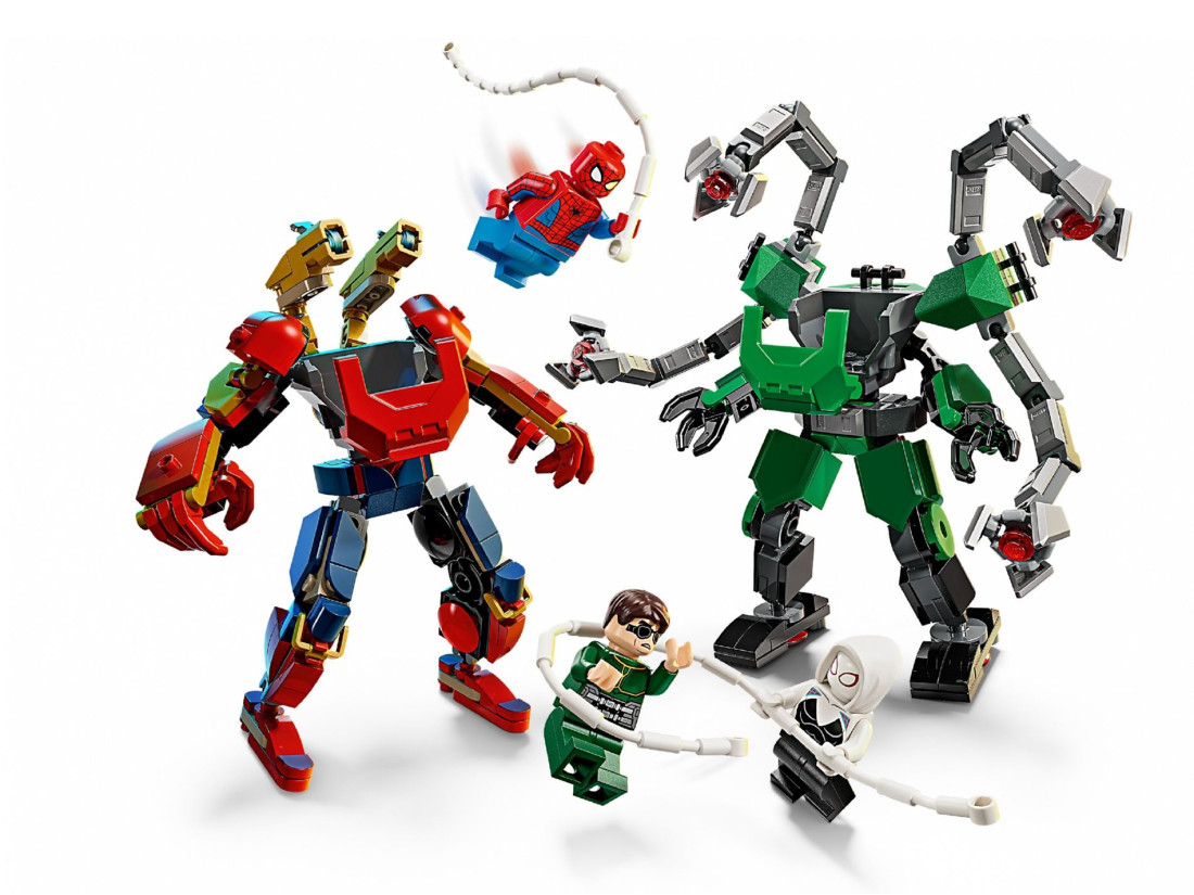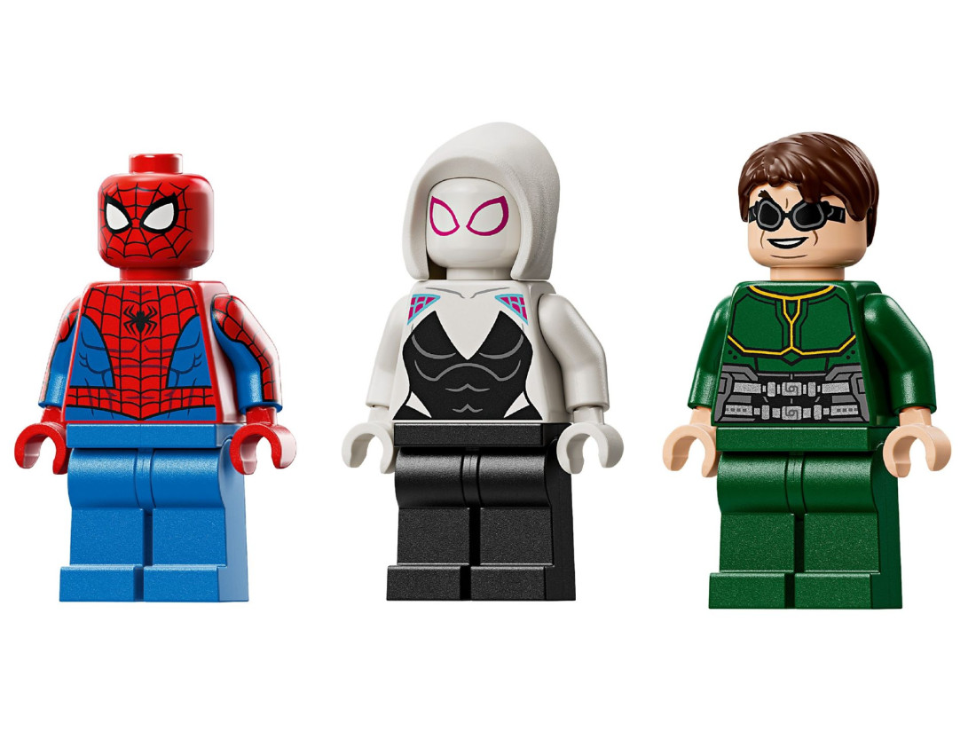 Мех Человека‑Паука выполнен в стиле Iron Spider: в открывающейся кабине размещается минифигурка, а на руках установлены два кнопочных шутера. Мех Доктора Осьминога выделяется четырьмя гибкими механическими щупальцами, которые легко настраиваются под захваты и блокировки. В комплект входит Призрачная Паучиха с набором паутинных лент; их можно крепить к мехам и минифигуркам, расширяя сценарии ролевой игры. Из 315 деталей собирается прочная игровая сцена; высота меха Человека‑Паука около 13 см. Совместим с другими наборами LEGO MARVEL для объединения боёв и персонажей.