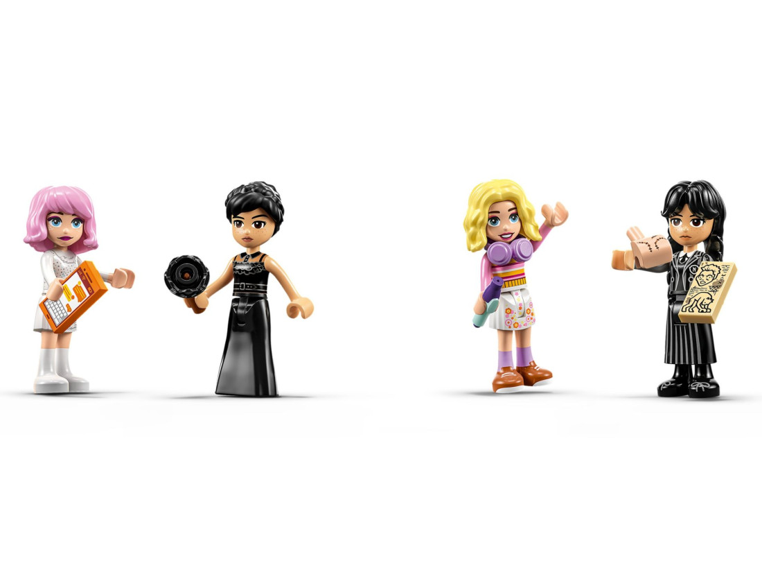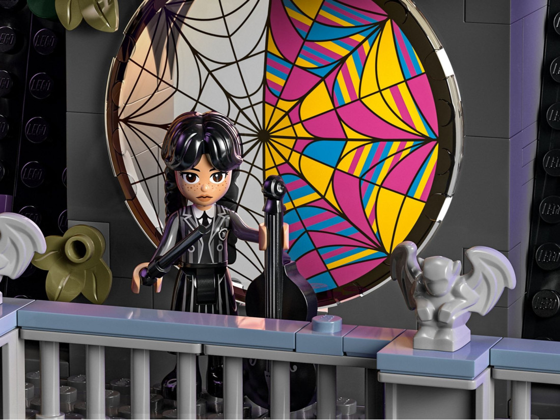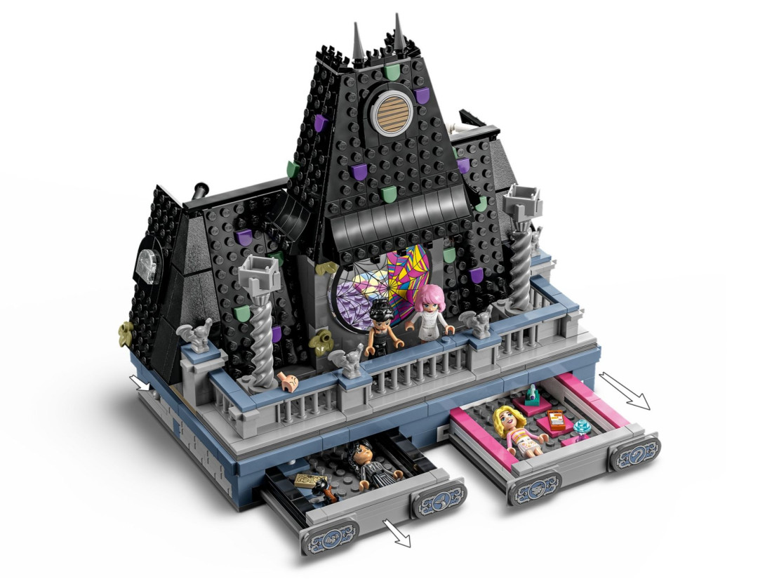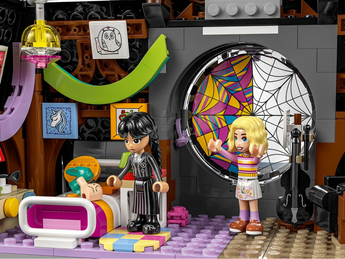 - Кімната в гуртожитку Академії Невермор – Набір включає кімнату з вікном у вигляді павутини, дошку для розслідувань та балкон з гаргульями, що додає ще більше інтриги та азарту.