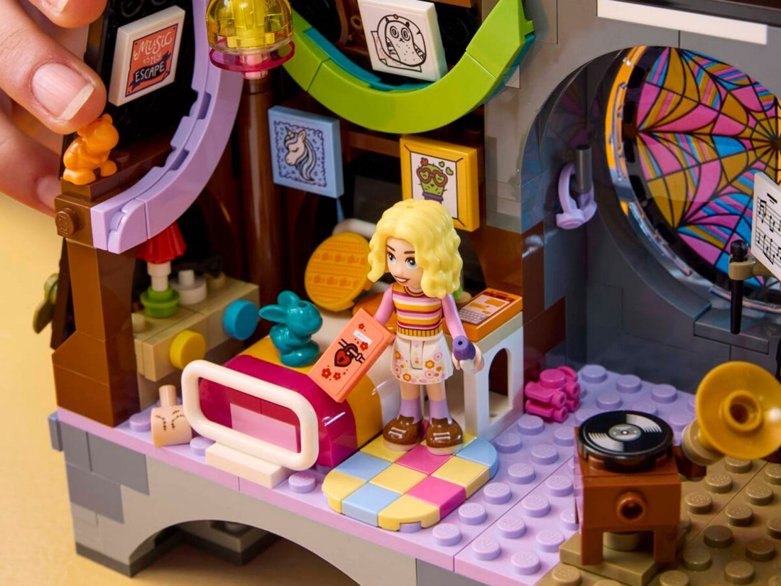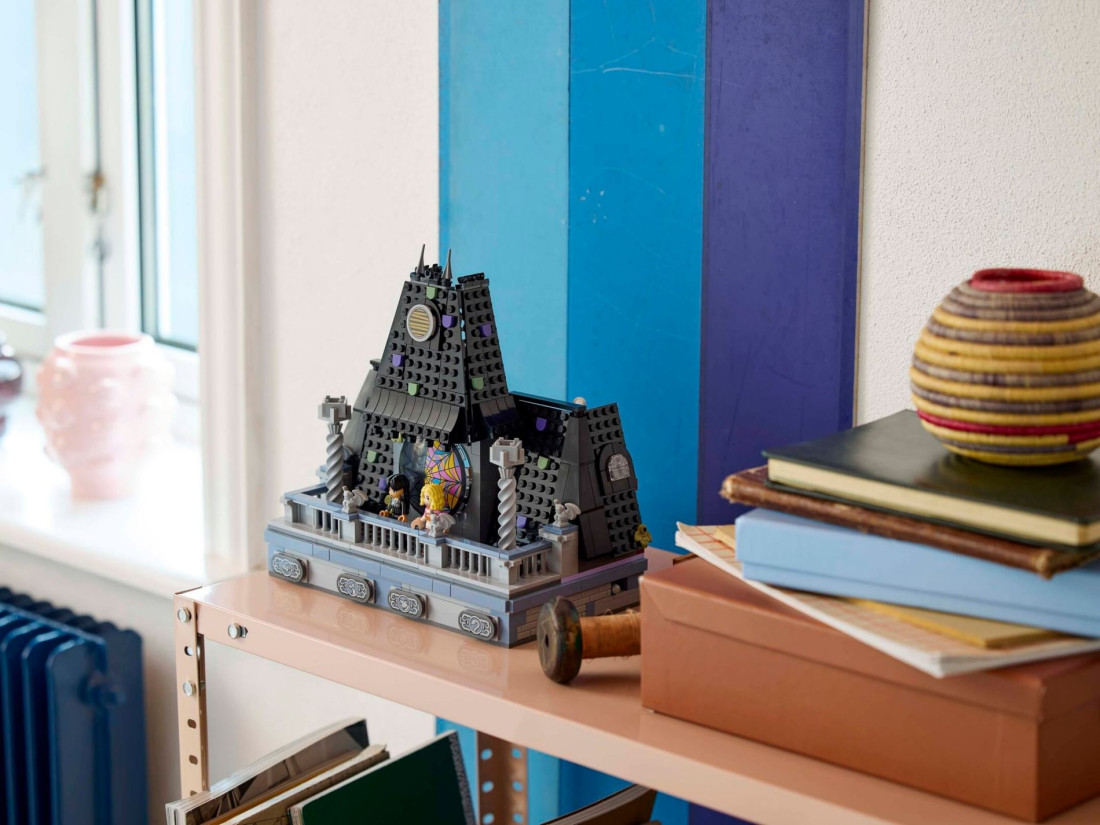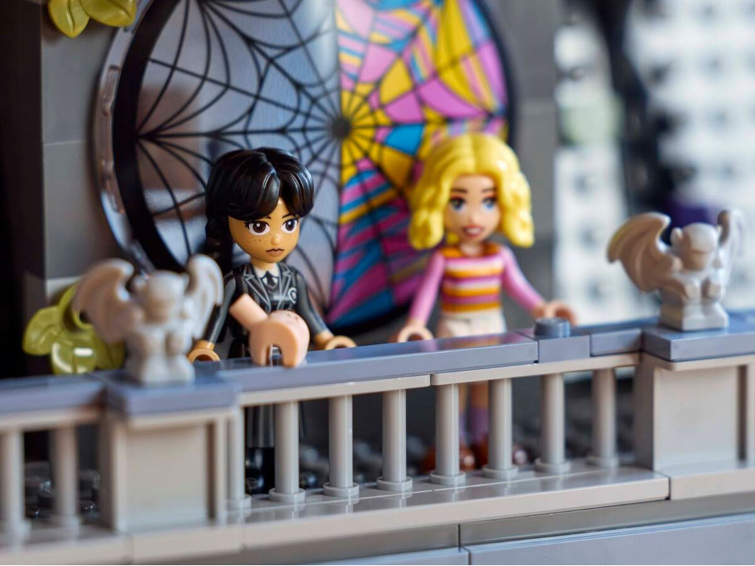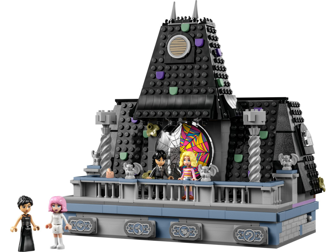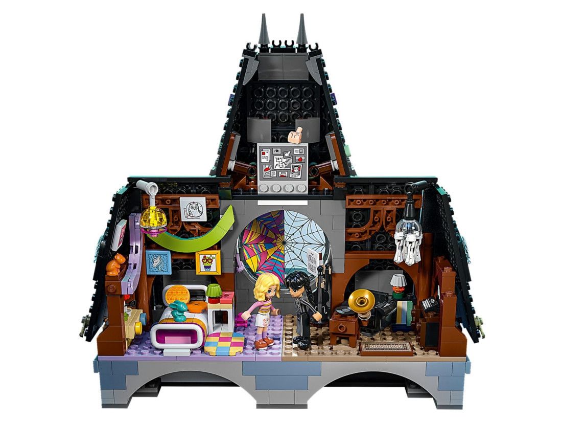 - Кімната в гуртожитку Академії Невермор – Набір включає кімнату з вікном у вигляді павутини, дошку для розслідувань та балкон з гаргульями, що додає ще більше інтриги та азарту.