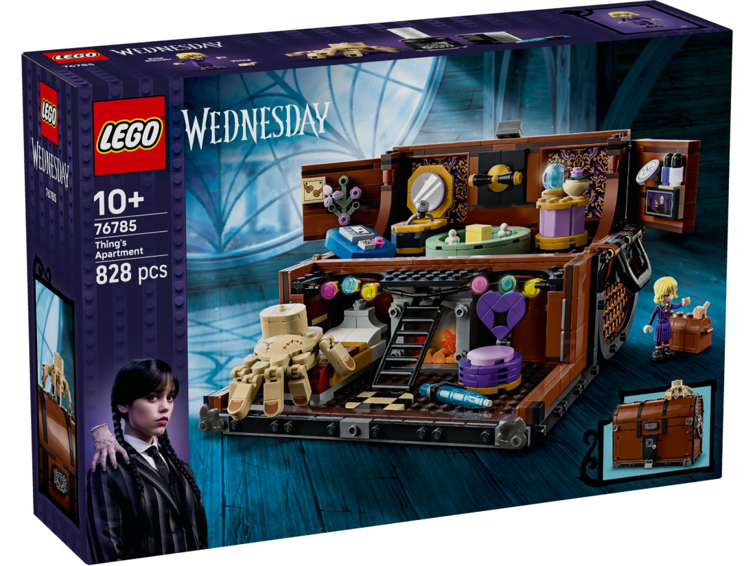 Набір LEGO WEDNESDAY «Квартира Речі» (артикул 76785) передає атмосферу серіалу в компактний «скринька-будиночок». 828 елементів складаються у портативну, деталізовану модель з ігровими зонами та декоративними елементами, яка підходить для експозиції та сюжетних сцен. Серія LEGO WEDNESDAY орієнтована на шанувальників від 10 років: всередині передбачені відкидне ліжко, стілець, ніша для аксесуарів і відділення з міні-предметами на кшталт наклейок для нігтів, лаку та крему — такі деталі додають характеру й легку іронію.